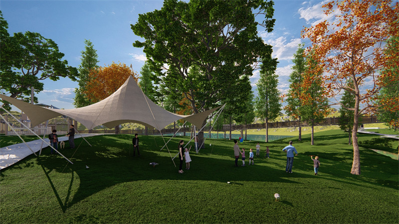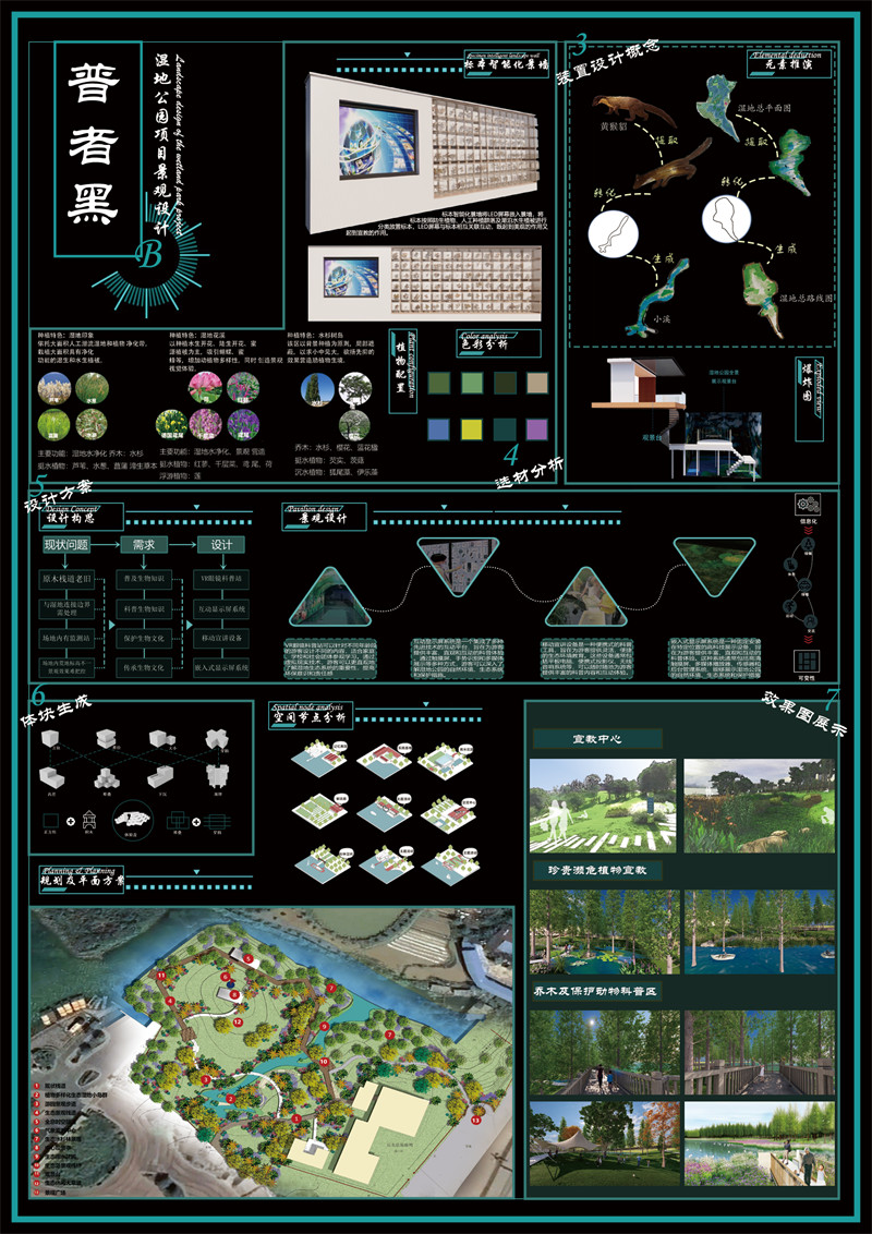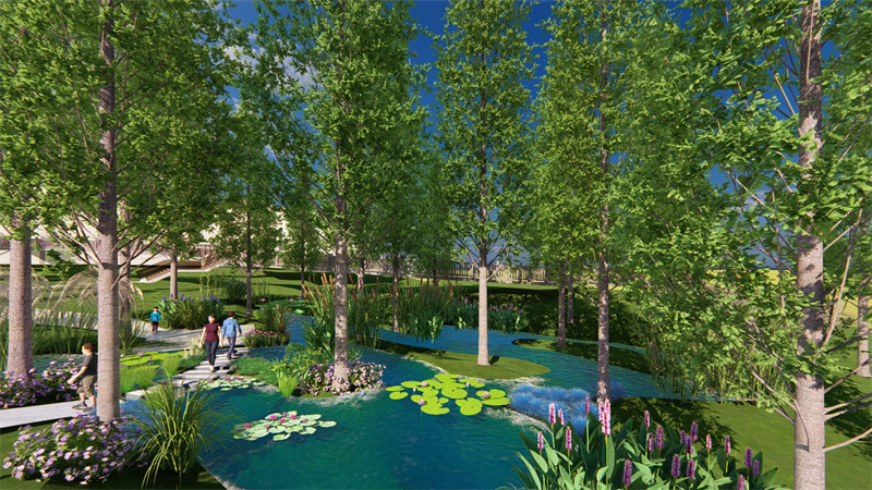 - 在游园景观不到用下沉透明景墙进行湿地断层结构与湿地净化功能科普;