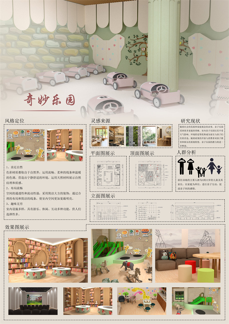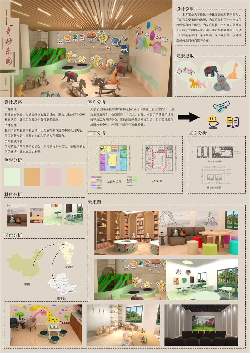 随着社会经济的快速发展和人们生活水平的提高,家庭对于孩子的关注度也越来越高。孩子是家庭的未来和希望,家长们愿意花更多的时间和金钱来陪伴和照顾孩子的成长。因此,亲子乐园这种集娱乐、教育和亲子互动于一体的场所应运而生,此设计的设计理念是为了提供一个让家庭成员共同参与、互动和享受乐趣的场所。它以亲子活动为核心,结合了儿童游乐设施、亲子互动设施等项目,为家庭提供了一个全方位的娱乐和教育机会。乐园注重亲子关系的培养和加强,通过提供各种亲子活动,比如亲子游戏、亲子阅读、亲子观影等,促进家庭成员之间的交流和合作。乐园设置的亲子区域,为家庭提供一个私密的空间,鼓励家长和孩子之间的亲密互动。此乐园注重教育和启发孩子的潜力,因此乐园了设置各种游乐设施,如益智玩具、艺术创作区域等,让孩子在玩乐的同时学习新的知识和技能。乐园里的手工制作、绘画、滑梯、阅读等,让孩子开阔眼界,培养他们的创造力和想象力。