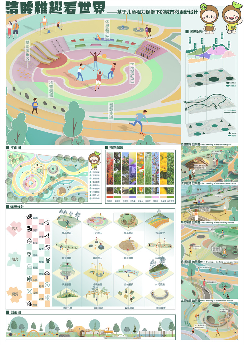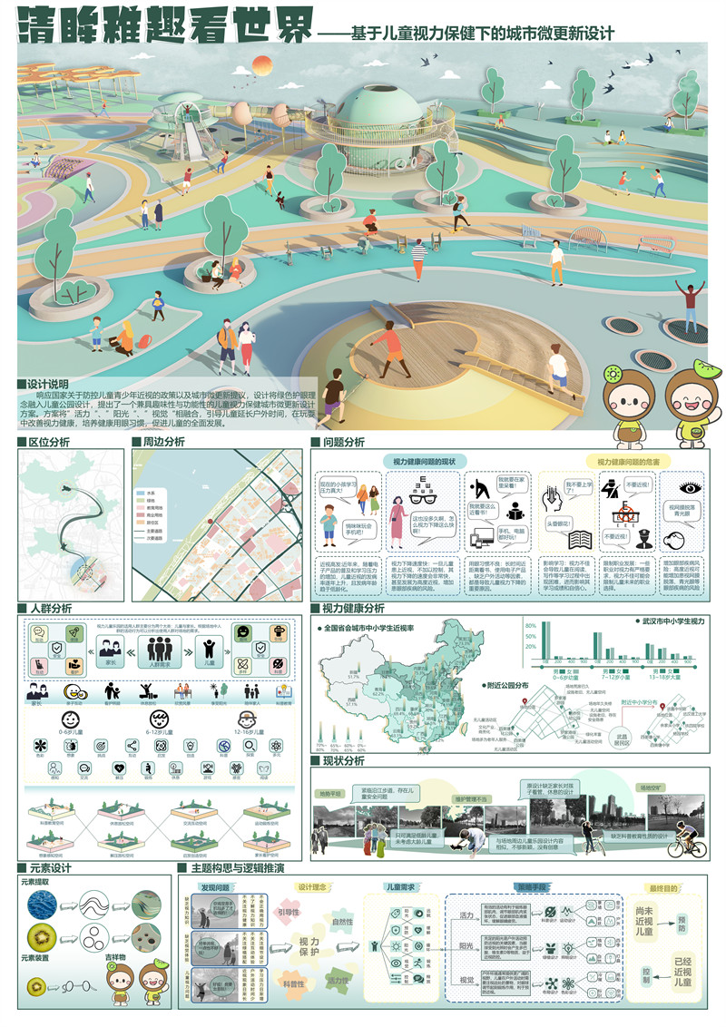 随着现代社会电子设备的普及和学业压力的增加,儿童青少年近视问题日益严重。国家出台了一系列防控儿童青少年近视的政策,强调增加户外活动时间对预防近视的重要性。同时,城市微更新概念的兴起,为优化城市公共空间提供了契机。基于这样的背景与机遇,本精心构思的方案应运而生。其核心目标明确而坚定,旨在通过对儿童公园进行全方位、深层次的更新设计,巧妙且自然地将绿色护眼理念如同一根坚韧的丝线,贯穿于公园的每一个角落与细节之中。致力于匠心打造出一个独一无二的户外活动场所,这个场所宛如一个充满魔力的奇幻乐园,不仅要洋溢着无尽的趣味与欢乐,能够像磁石一般紧紧吸引孩子们的目光与好奇心,使其迫不及待地投身其中,更要具备科学有效且系统全面的视力保健功能,打造一个既充满趣味又能有效促进儿童视力保健的户外活动场所。以 “活力”“阳光”“视觉” 为核心元素,营造富有吸引力的儿童公园环境,激发儿童主动参与户外活动的兴趣,延长其在户外的停留时间。融入绿色护眼元素与功能设施,在儿童玩耍过程中,通过自然环境刺激和特定的视力保健活动,帮助改善儿童视力健康状况。还注重在公园中培养儿童良好的健康用眼习惯。通过在各个活动区域设置清晰醒目的标识,提醒孩子们保持正确的用眼距离;合理规划安排休息区域,并在这些区域配备一些简易的眼部放松设施,引导孩子们适时地进行眼部放松休息,如闭上眼睛安静休息片刻或者进行简单的眼部按摩操等。通过这些方式,逐步提升儿童对视力保护的认知水平以及重视程度。最终期望这个经过更新设计的儿童公园,能够全方位促进儿童在身体锻炼、心理健康以及社交互动等多个方面实现全面发展,培养儿童健康用眼习惯,如正确的用眼距离、适时的眼部放松等,提升儿童对视力保护的认知与重视程度。促进儿童在身体、心理、社交等多方面的全面发展,使公园成为儿童成长的有益空间。