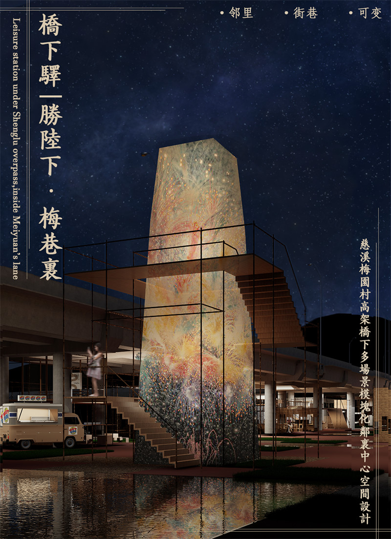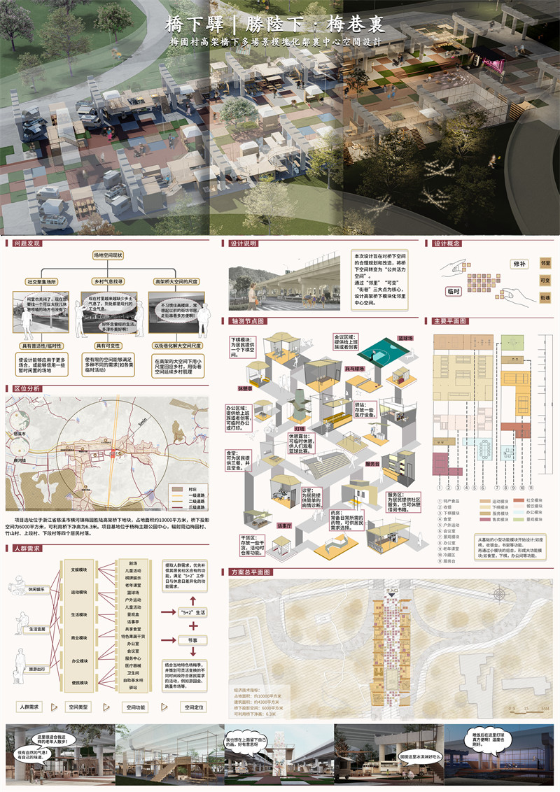 本次设计旨在对桥下空间的合理规划和改造,将桥下空间转变为“公共活力空间”,以“邻里”“街巷”“可变”三大点为核心,模块化为手法,打造高架桥下邻里中心空间。