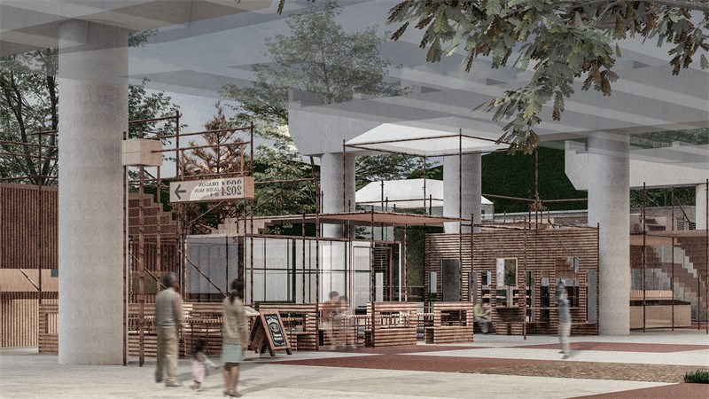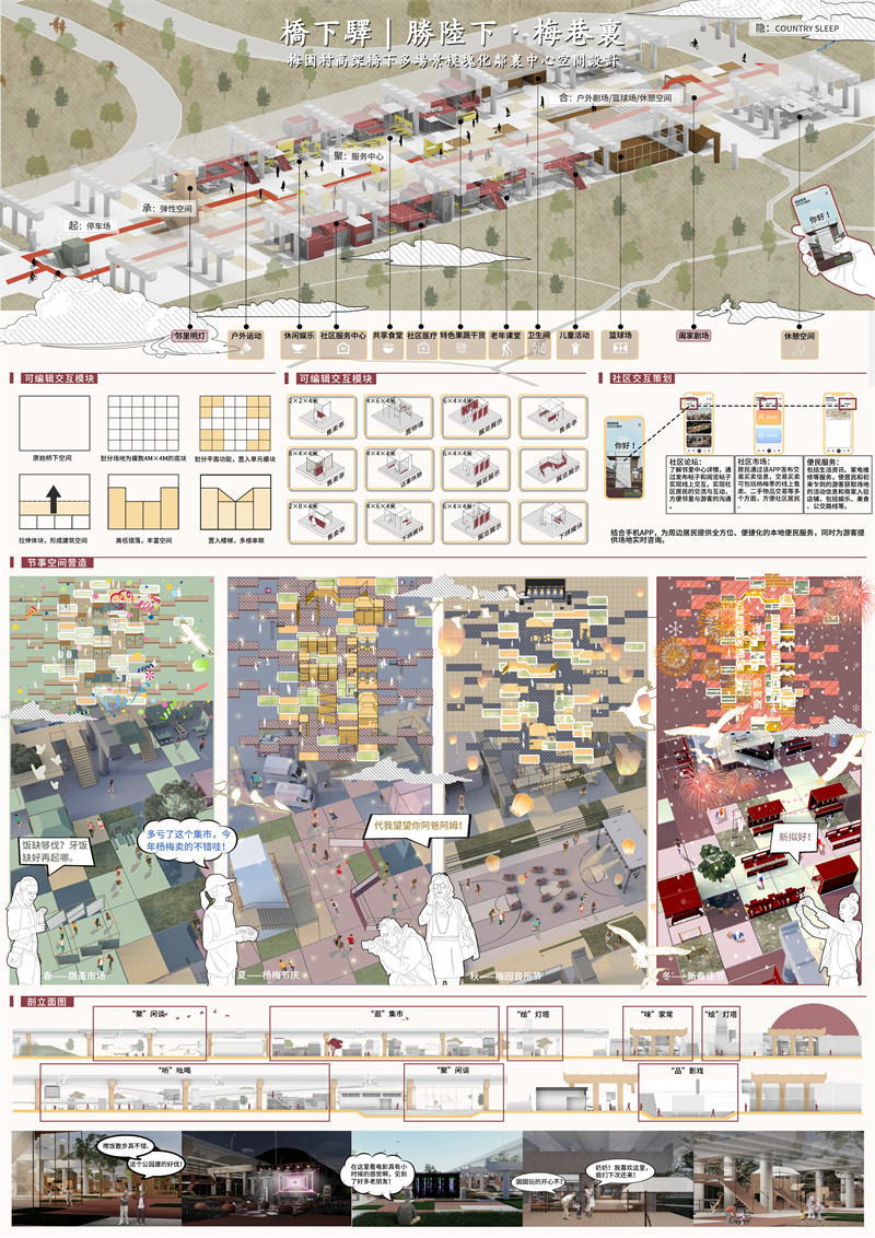 本次设计旨在对桥下空间进行合理规划和改造,以“邻里互助”、“业态可更新”、“街巷文化”为特色,我们将充分利用“5+2”生活和节事的特性,为周边村落提供一个便利的聚集地,并在周末和节日举办主题节庆活动,促进社区共融和文化交流。