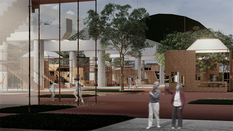 合:运动后花园:我们以标准篮球场为基底打造了一个可变换的下沉式户外广场。根据村民不同的需求可以变化成移动集市、广场舞、篮球场等功能。