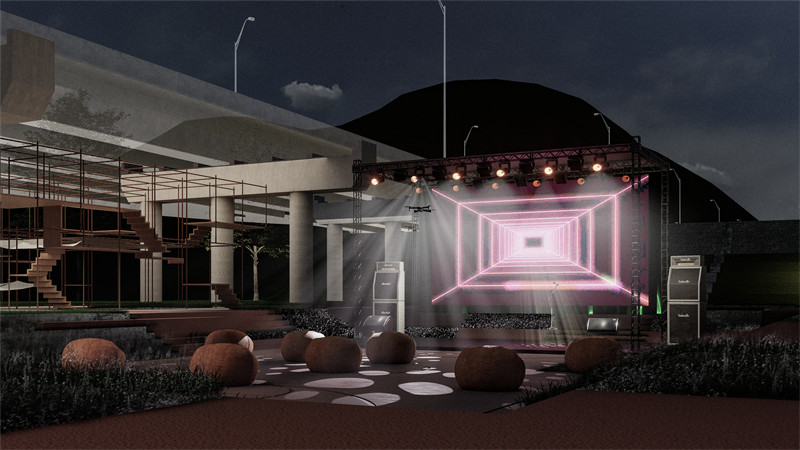 起:场地入口:将原本窄腰型入口进行拓宽,以一种更加开放的姿态拥抱前来的人。并且在材质上,我们选取了竹钢以此来回应乡村。