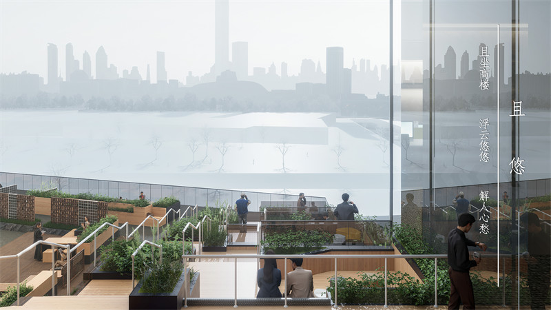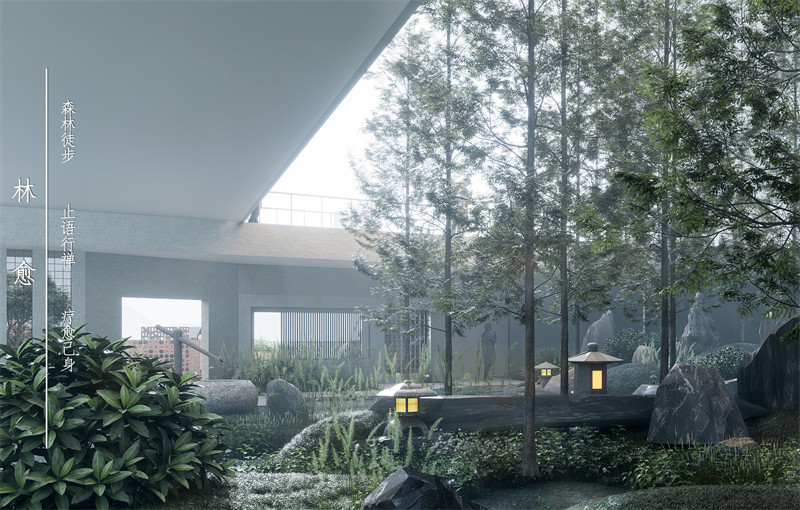 项目位于南京国金中心的屋顶,南京南京国金中心由香港地产E擘新鸿基地产精心打造的大型商业综合体项目。项目周边有许多办公楼,快速发展的城市加快了人们的生活节奏也给予城市办公人口过大的精神压力,本项目旨在南京国金中心的屋顶营造一片”都市绿洲”,为来往办公的人群提供良好的心情疗愈环境。都市绿洲心灵驿站是一个集自然融合、身心放松、空间互动于一体的宁静空间。通过精心规划和设计,使白领人群在忙碌的工作间隙能够找到一片宁静的避风港,放松身心、恢复活力。本项目将场地划分为四个板块,依次为:“林愈”-过渡空间、“且悠”-身体放松空间、“知闲”-心灵放松空间、“归院”-私密空间。四个板块的空间循序渐进,将办公空间与自然环境相融合让人感受到空间的流畅与和谐,创造出一种现代又自然的景观空间,能够给人提供保护和安全感。