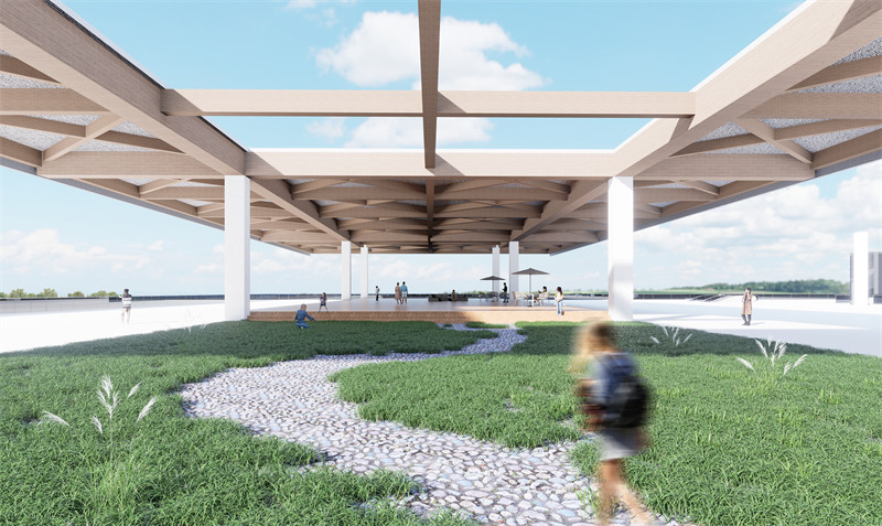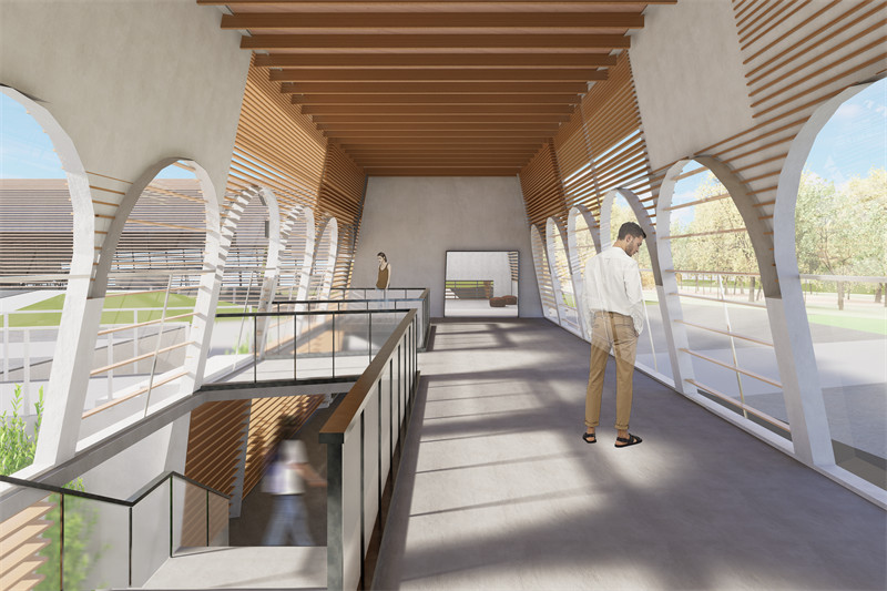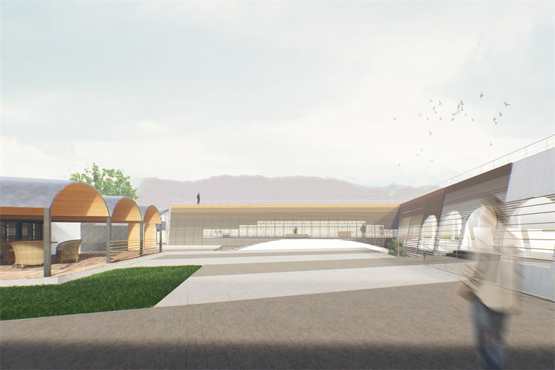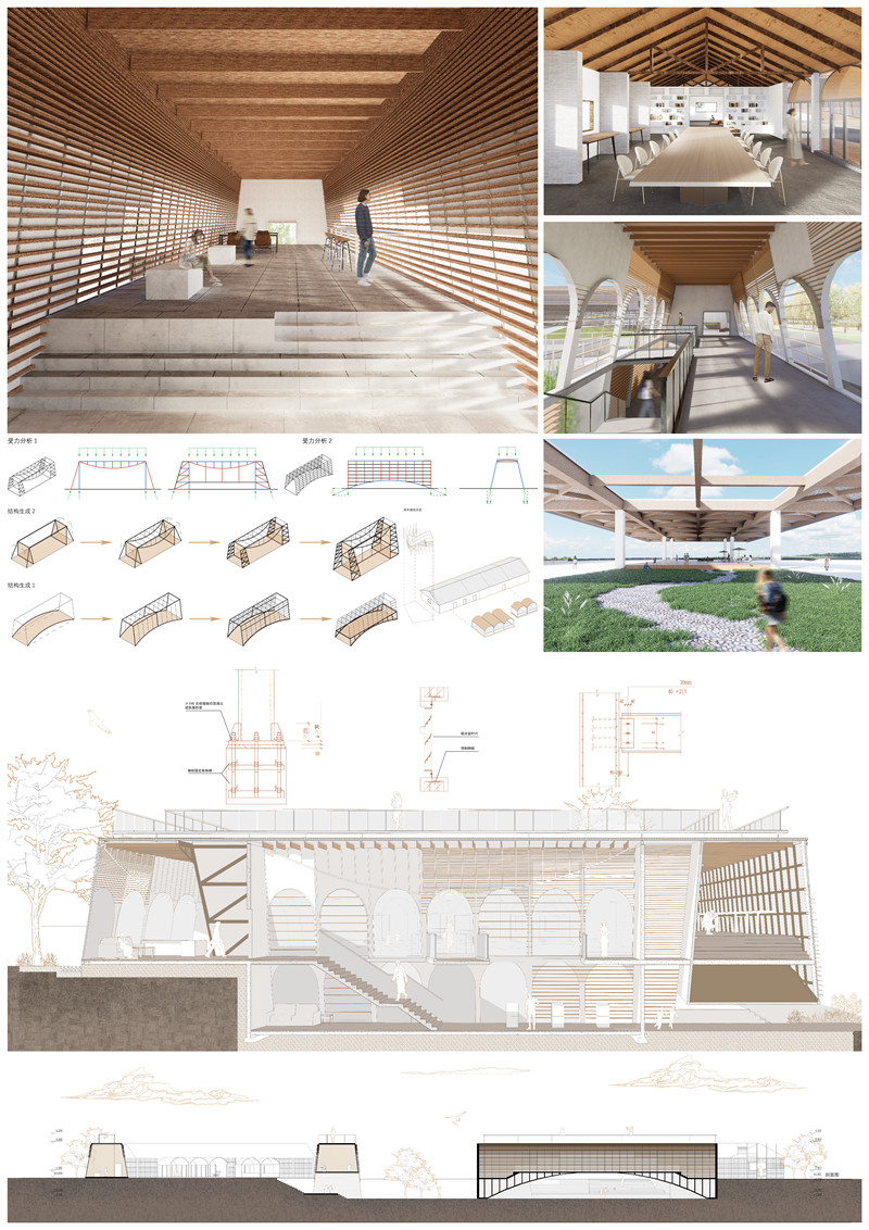 课程中期运用手工模型推敲桁架、悬索、拱、反拱等不同结构选型。最终基于基地北侧特色建筑白灰窑,提取其中的“拱”元素,并选用金属拱作为部分加建建筑的结构原型,形成长条状单向大跨空间。建筑内L形空间及拱桥空间均选用拱形张弦梁结构,使得景观面无柱,建筑整体更加通透,视线畅通无阻。