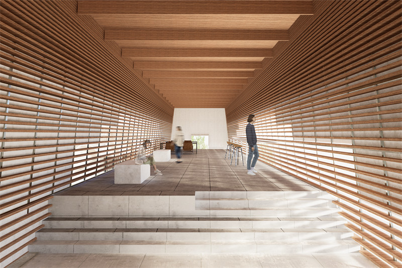 建筑采用合院式形体布局,保留了部分宅基地内西侧原有建双坡屋顶筑并进行旧房改造,保留其桁架屋顶结构并进行加固。其余三面用新建筑进行围合形成内院,同时最大限度延展基地西北侧最佳景观面,开拓景观视野。场地整体呈现南高北低的现状,我们引入了“桥”的设计原型。“桥”上空间设计为茶饮空间,保留基地最佳景观面,开拓景观视野,“桥”下空间设计成景观楼梯解决场地高差问题。入口处增设室外观景平台,并延伸至建筑屋顶,形成U形屋顶观景流线,游客可以在屋顶观赏整个栗峪口村的风景。