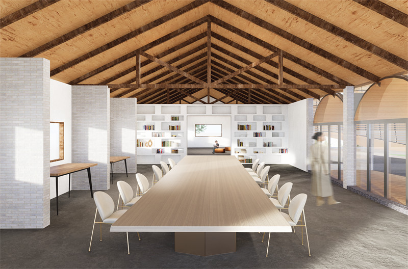 建筑功能简单,流线清晰。入口布置在基地东南角,与村内道路相接,方便游客进入。沿入口进入,东侧为双侧展厅。北侧最佳景观面为核心精神空间,功能为咖啡休闲;西侧保留原有建筑,为娱乐阅读区。