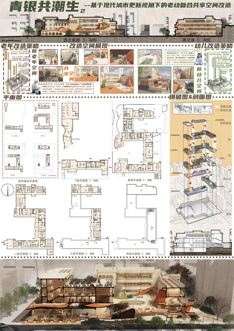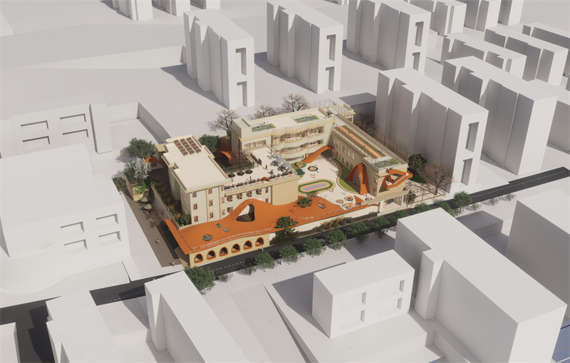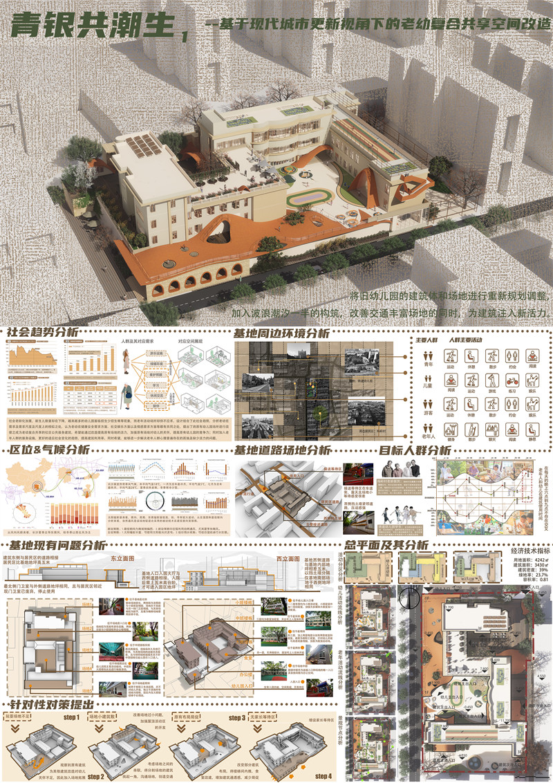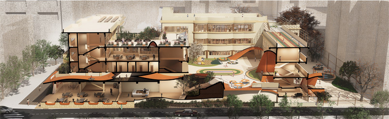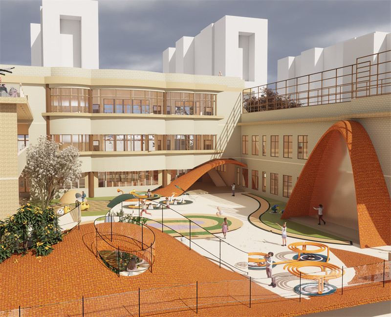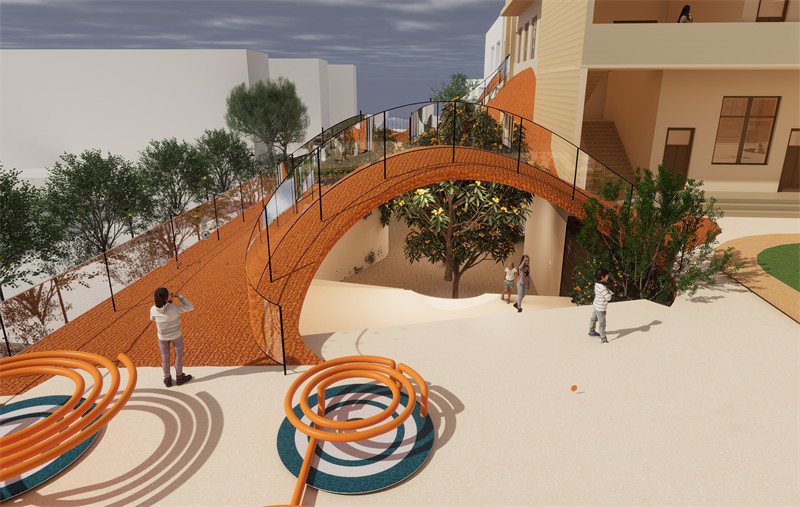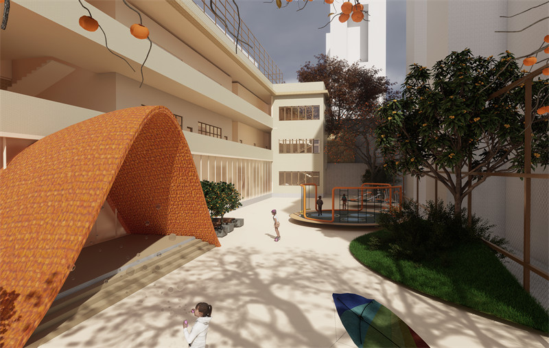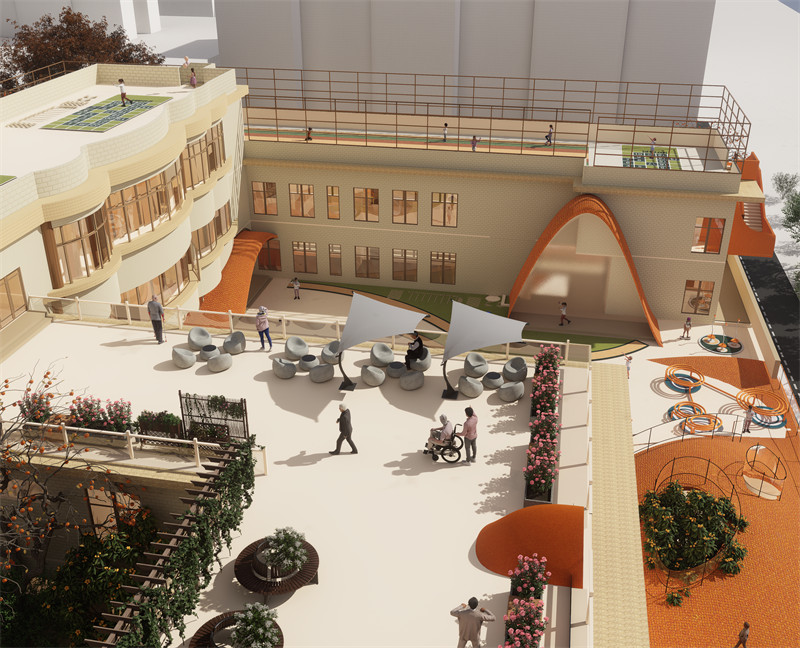 设计对点到具体场地问题,点对点解决问题。设计将旧幼儿园的建筑体和场地进行重新规划调整,加入波浪潮汐一半的构筑,改善交通丰富场地的同时,为建筑注入新活力,解决了原有的玩耍场地缺失、童趣不足等问题。同时将荒废的空间利用起来,为附近的老年居民创造了一个活动学习的空间,也希望幼儿的活力能够感染老年人。此外,也开发了一块公共休息空间,不仅解决了原有建筑垂直交通不便的问题,也解决了幼儿家长接送孩子的等待体检不好的问题。