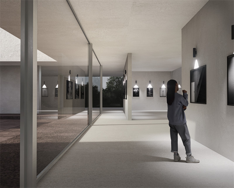 整体流线是自北入口,环绕大天井一圈,经过石子路最后进入大天井。入口区域在河边留出一块灰空间供人观赏,插入的老墙形成一处庭院,可供人游走,往南为最大的展览区。对于西侧小天井,使用大半位于建筑内,使其能连通室内外。二层为活动区域,可以开展艺术手作活动,艺术教育等,设有露台可以开展户外活动。除主要环绕流线,还没置2条次要环绕流线,分别经由小天井到室外与老墙庭院,在局部产生小园林的游览感。