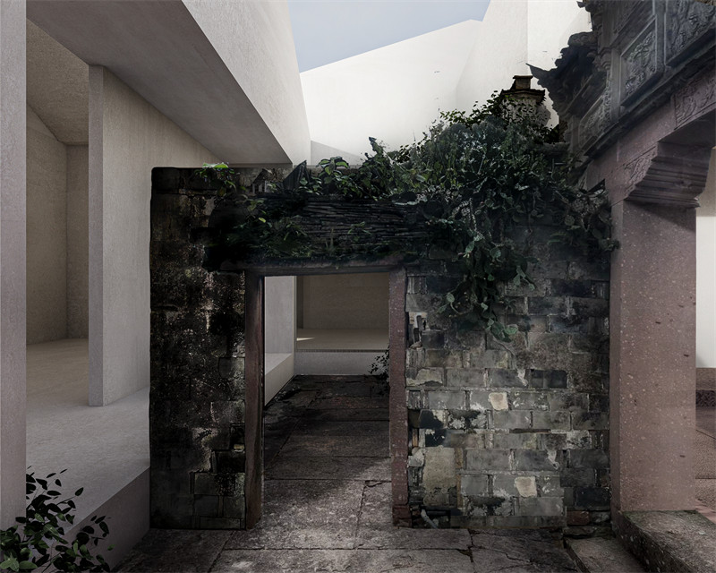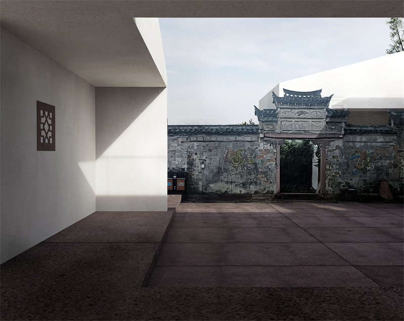 采用不搞大拆大建的方式,最大限度保留原有建筑,注意拉开新建筑与老建筑的差距,以突显保护老建筑。大天井与灰雕门楼作为整个建筑的中心另一个小的天井则与一栋白屋相结合,使天井从室内延展到室外,残破的老墙则裸露在外。河边的老墙则穿插于白色屋中,作为一处室外庭院。新的白屋穿插在旧址中,串联起旧址,既丰富建筑材料肌理,也能保护利用古建筑,让艺术中心成为古建筑的介绍者。