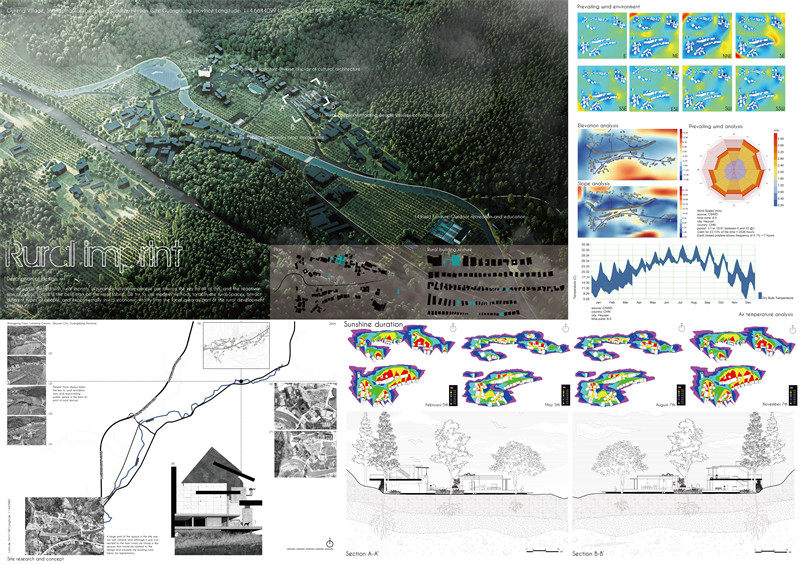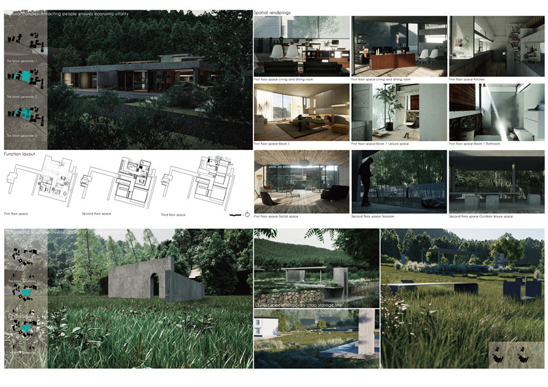 设计不仅尊重乡村现有肌理与结构,还以现代化手法更新空间,平衡传统与现代需求。通过聘用村民参与项目运营,如农耕指导、烹饪与民宿服务,提升村民收入,实现社区参与的全面性。最终,本设计以“乡村印迹”记录乡村发展历程,在保护生态与文化的同时,为乡村注入现代经济活力,试图打造可持续发展的乡村振兴典范。