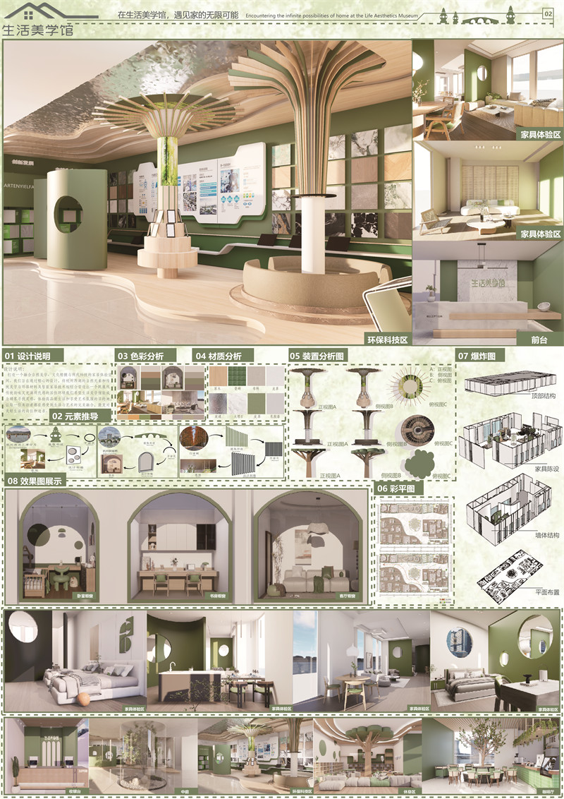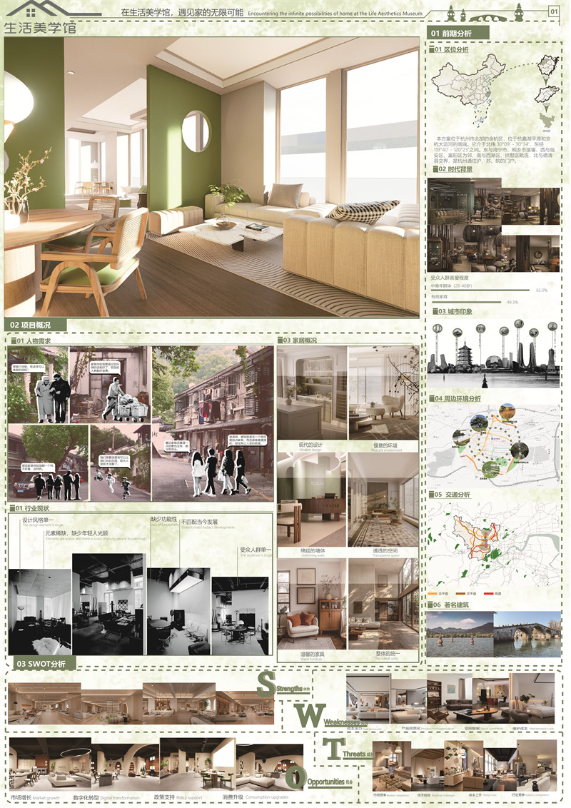 设计愿景:我们希望生活美学馆能成为顾客寻找灵感、体验高品质生活和享受艺术氛围的目的地。通过精心的设计,我们将杭州西湖的自然元素和传统美学与环保材料及智能家居技术相结合,营造出一个既展现传统韵味又充满现代感的居住环境。