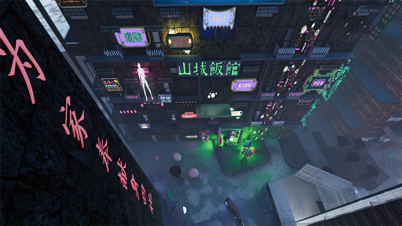 赛博朋克风格的灯光色彩以冷色调为核心,大量运用蓝色、紫色、青色等冷色系,这些色彩不仅给人以未来科技感,还营造出一种神秘、幽暗的氛围。冷色调的灯光仿佛让人置身于一个充满未知与幻想的未来世界。为了打破冷色调的沉闷,加入了一些暖色调的元素,如粉色,金色。这些暖色调的灯光犹如夜空中闪烁的繁星,为整个场景增添了一抹亮色,形成强烈的视觉对比,让赛博朋克风格更加鲜明、独特。
