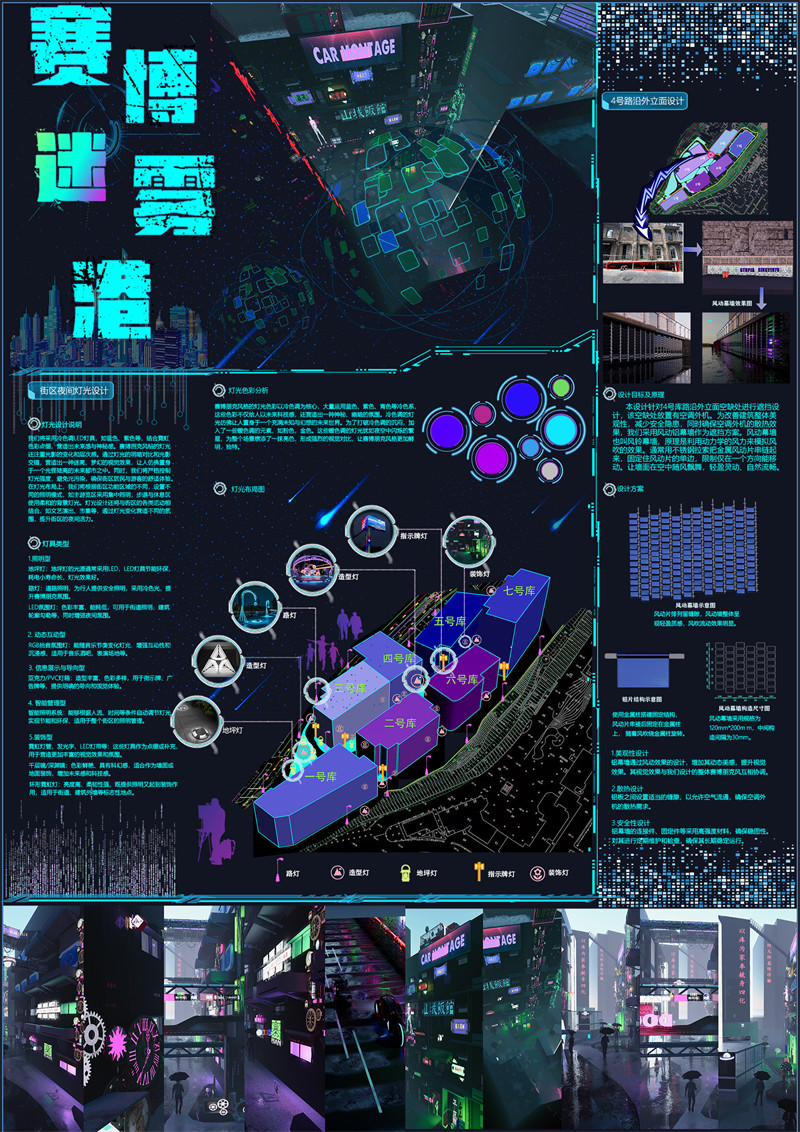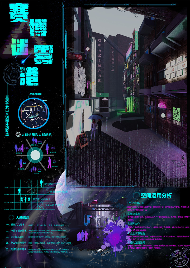 如外墙的条石、柱子等,同时融入保留金紫山文创园的历史建筑原貌赛博朋克风格的元素。金紫山文创园保留原有建筑风格的基础上,通过添加现代科技元素如LED显示屏虚拟现实设备等使文创园呈现出未来感文创园内设置动态光影效果如激光投影灯等,营造出神秘而紧张的氛围赛博朋克利用金紫山文创园的立体空间布局设置不同高度的平台走廊和楼梯利形成错落有致的景观。
