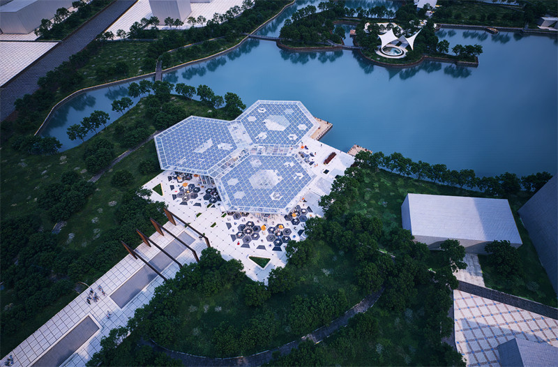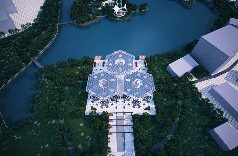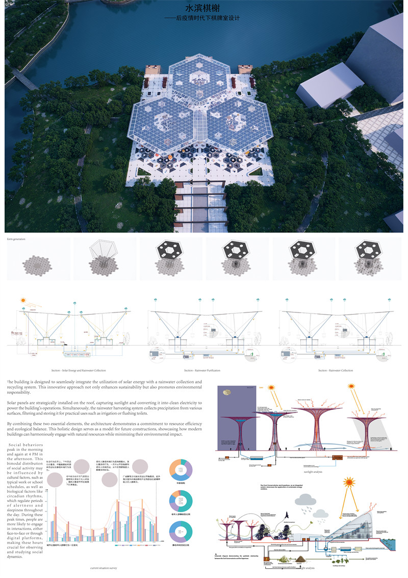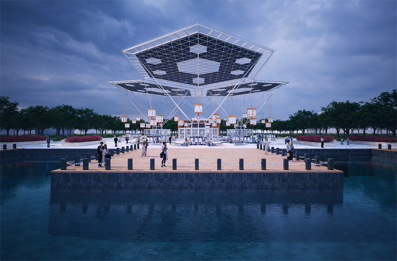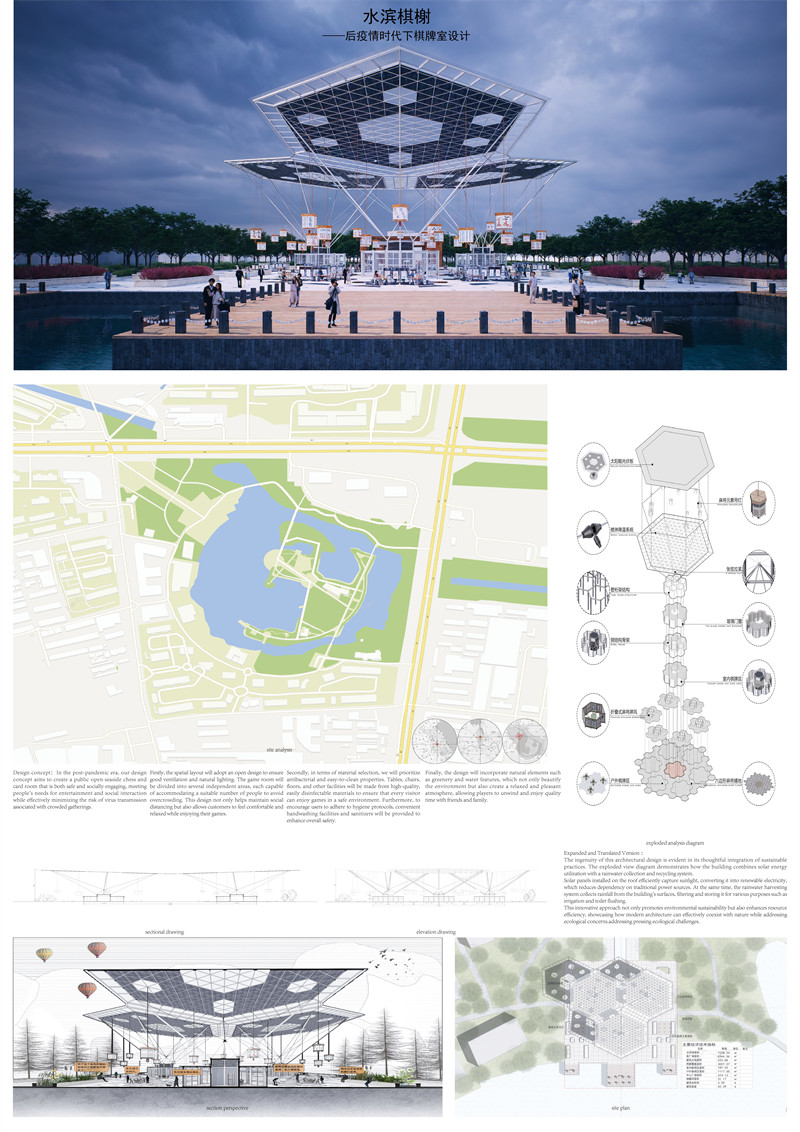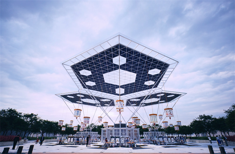 此次设计针对以上问题,提出对城市公园中空间宽阔的公园广场进行更新改造,场地选择位于扬州市广陵区的曲江公园,并置入可遮风挡雨的管桁架构架,并在管桁架结构上搭载光伏发电板,创造遮阳避雨的户外环境,在尽量不干预原本场地属性的情况下,打造光电树下共享棋牌空间,尝试为后疫情时代城市中老年人提供一个安全且空气流通的室外娱乐环境。