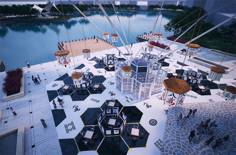 设计思路:营造一个能够适应户外天气变化且空气相对流通的棋牌娱乐环境。从点、线、面三个维度对城市公园中的空间进行活化利用,置入可折叠收缩的棋牌设施,打造城市棋牌公园,旨在为后疫情时代中老年人提供一个安全且空气流通的室外娱乐环境。点状空间以树下、亭子等空间改造为主,以单点的游憩空间为中心布置棋牌娱乐设施。线状空间以公园中的休息长廊为主要对象,打造线性的棋牌娱乐空间。面状空间以公园中的小型广场为主,在空旷的广场合理布置棋牌娱乐设施,并且适度引用多样化的室外麻将形式——如水上麻将等,打造小型的麻将广场。