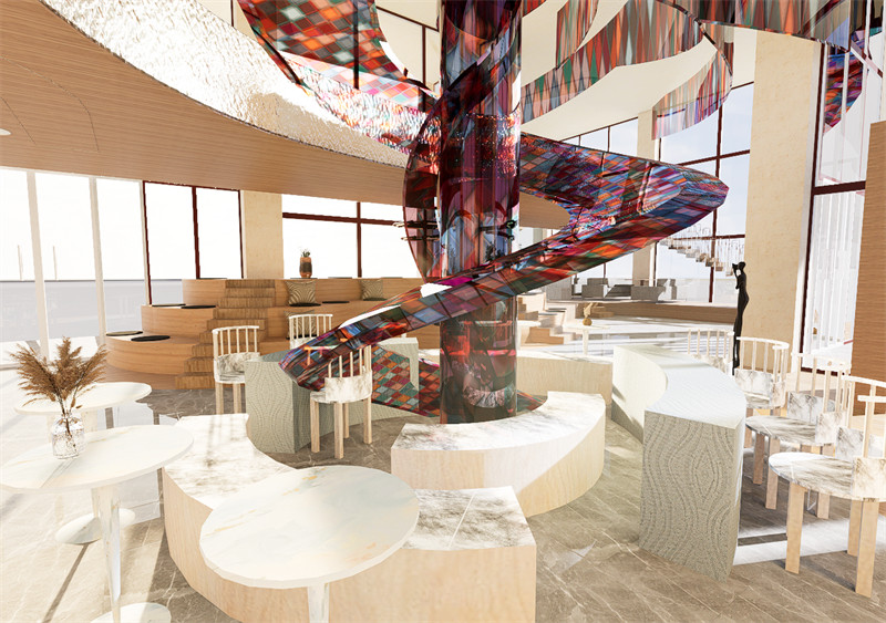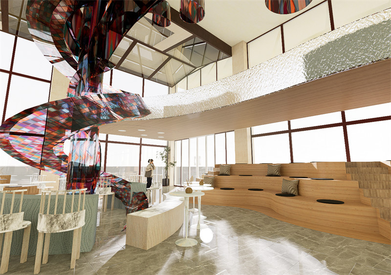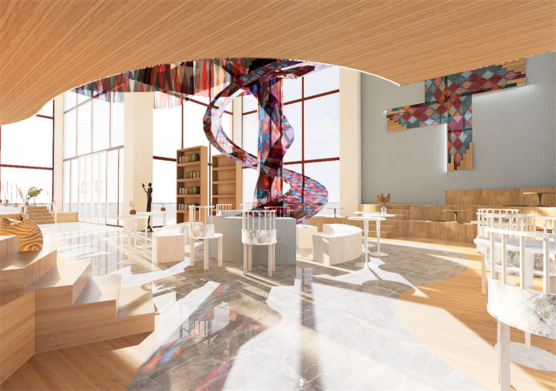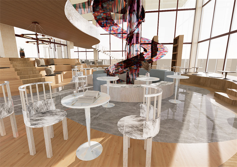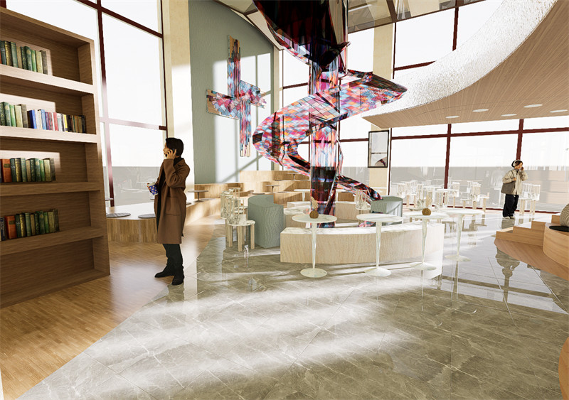 设计思路:我们前期明确了定位与目标客户:确定咖啡厅是走高端奢华、平价亲民还是特色小众等路线,了解目标客户的年龄、喜好、消费习惯等,比如面向年轻上班族就可设计得更时尚便捷,针对文艺青年则可增添更多文艺氛围元素。我们根据空间大小和形状灵活规划座位,有双人桌、四人桌、多人卡座等多种形式,注意桌椅摆放要方便顾客进出且保证一定的私密性。以及阅读区搭配了少量深色调作为辅助色,用于突出重点区域或装饰元素,用深色的书架边框来增强书架的立体感。在墙上挂了与阅读相关的艺术画作、名言警句的书法作品等,激发读者的阅读兴趣和思考。摆放适量绿植,既能净化空气又能为阅读区增添一份自然生机,缓解读者的阅读疲劳。可以在书架上放置一些小摆件,如复古的书立、精致的书签等,作为点缀,让阅读区更具个性和品味。 突出咖啡厅自身的独特个性,区别于其他普通咖啡厅。通过独特的主题来实现,设计了从空间布局到装饰细节都围绕这个独特主题展开,吸引追求与众不同、喜欢探索新鲜事物的顾客,让他们在享受咖啡的同时,能沉浸在独特的主题氛围之中