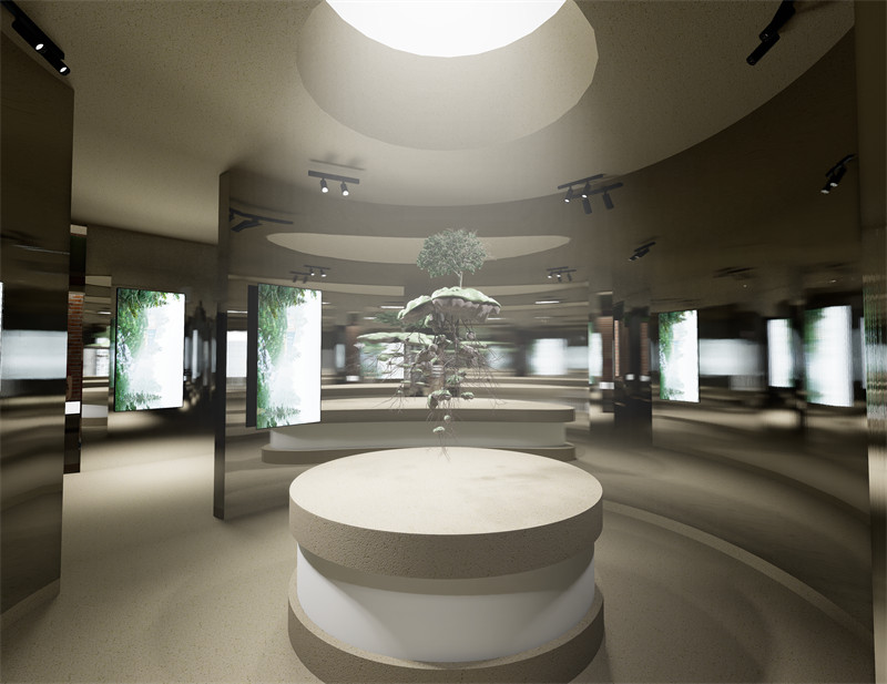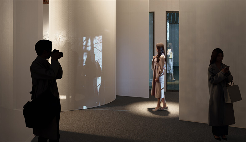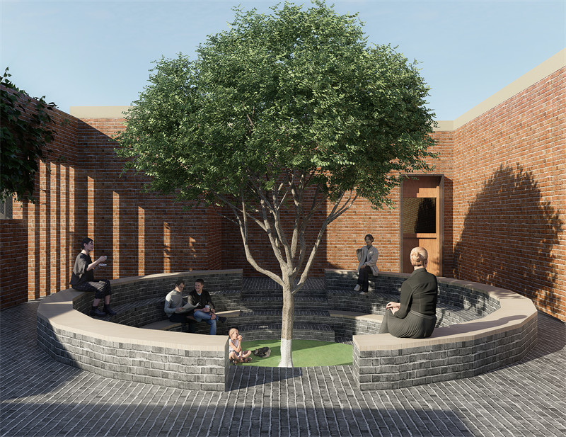 设计思路:“业态空间”主要引入当下最受欢迎的咖啡店、茶室、书吧。书吧位于水流东侧,以符合人体工学尺度的角度开设条窗,为公众提供有趣的观赏视线。在业态空间处,多出进行人文关怀角度考虑,在原本违规搭建以及古树处利用更现代更简洁的手法打造灰空间,引用不同的手法增强院落空间层次感。在院落较为明显处设有无障碍卫生间等残障人士友好设计。“展览空间”在满足防火规范的要求下,利用灵活的片墙营造多处趣味空间节点。在展览形式上考虑了装置艺术展厅空间、传统艺术品展示空间、数字艺术展览空间,我们欢迎社会广大艺术家进行投稿展览,另外在特殊期间,展览空间也会召集在济大学生艺术作品收集(包括:摄影、建筑学、雕塑、工业设计、美术学等专业),可以提高小众艺术家以及大学生作品宣传同时增强艺术馆的社会公益性以及社会传播性。