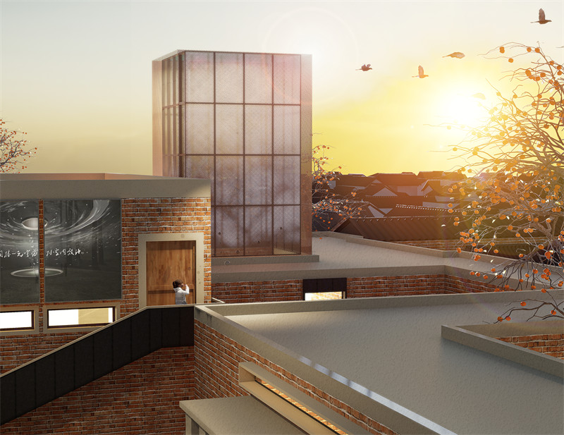 改造主要分为三大部分:业态空间、办公空间、展览空间。结合场地王府池子观景优势,在场地南侧将原有三个建筑改为业态空间,立面设计上,选择将其南向墙体视线打开,结合建筑原肌理形态选择多出引用转角窗,另外在立面风格上,顺应传承百花洲传统建筑“青砖”为主要建筑材料。展览空间位于场地中部,在原有肌理形态下,在场地中心建立一个时光塔顺应晷这一概念,在一天的时间变化下,时光塔的光影如同日晷散布在场地各处。时光塔内部空间实用功能为装置艺术展厅,主用材料以玻璃幕墙、玻璃砖以及木栏网。太阳光打入塔内,艺术品跟随光影进行变化。在场地主要两个地段王府池子以及起凤桥,时光塔是一个高于场地的建筑体量,是整个艺术馆的精神高塔,同时具有吸引公众视线以及社会传播的特性。办公空间位于场地东北侧具有良好私密性。