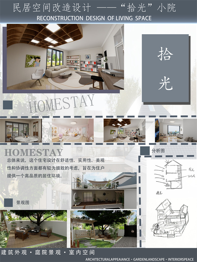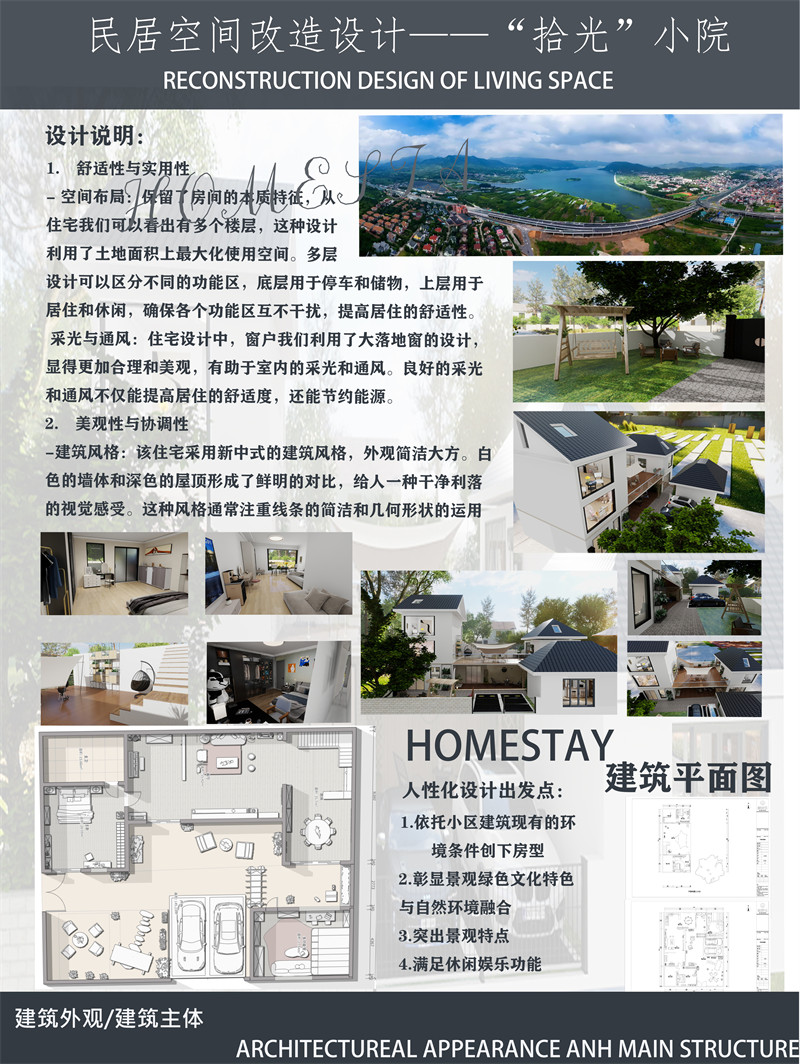 3.设计理念及思路:这栋房屋的设计思路和理念旨在打造一个功能齐全、舒适宜人、与自然和谐共处且具有新中式风格的居住空间。通过合理的功能分区、空间利用和动线规划,满足家庭成员的日常生活需求,同时以人为本,关注居住者的舒适度和健康。在设计理念上,融合自然元素,在旧房的基础上进行改造升级,设计出具有独具特色的新中式房屋使房屋与自然环境融为一体,并且通过现代美学的设计手法,赋予房屋独特的艺术魅力。