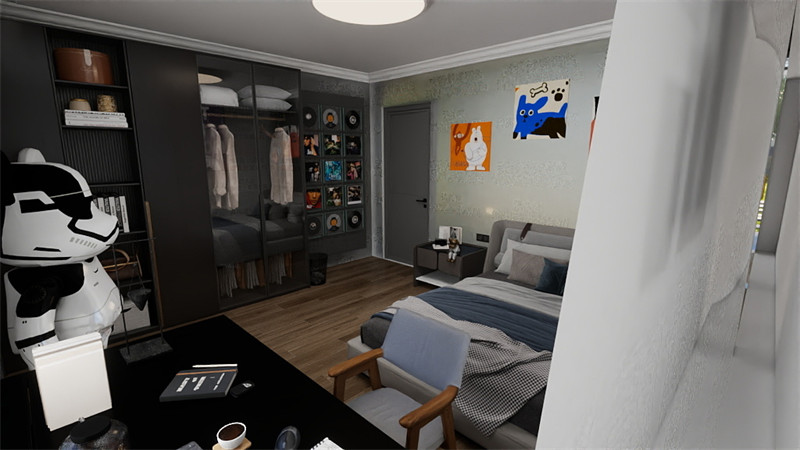 – 房间内的家具选择多功能的款式,例如带有储物功能的床和沙发,以满足日常物品的收纳需求。