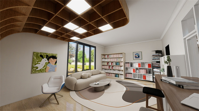 – 公共区域:房屋的底层主要规划为公共活动区域,包括客厅、餐厅和厨房,室外设计了一个书房。这些空间相互连通,形成一个开放式的布局,方便家庭成员之间的互动和交流。客厅设计大面积的落地窗,引入充足的自然光线,阳光更加充足同时可以欣赏到室外的景观。