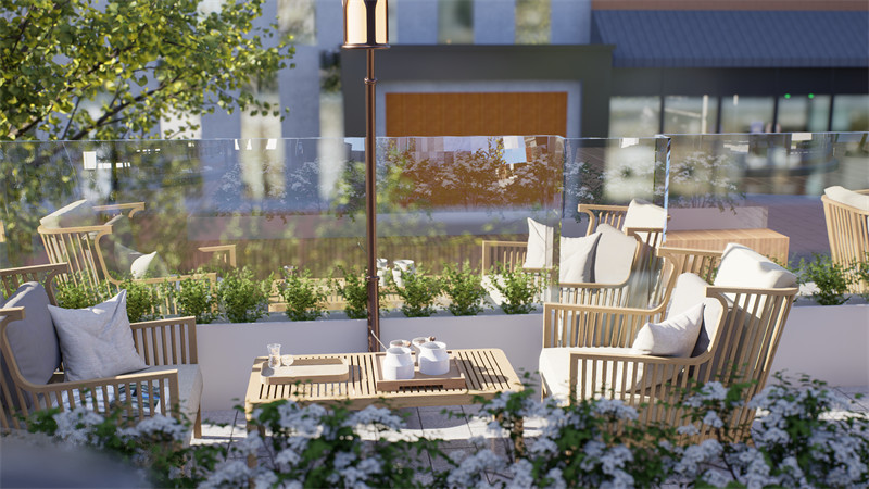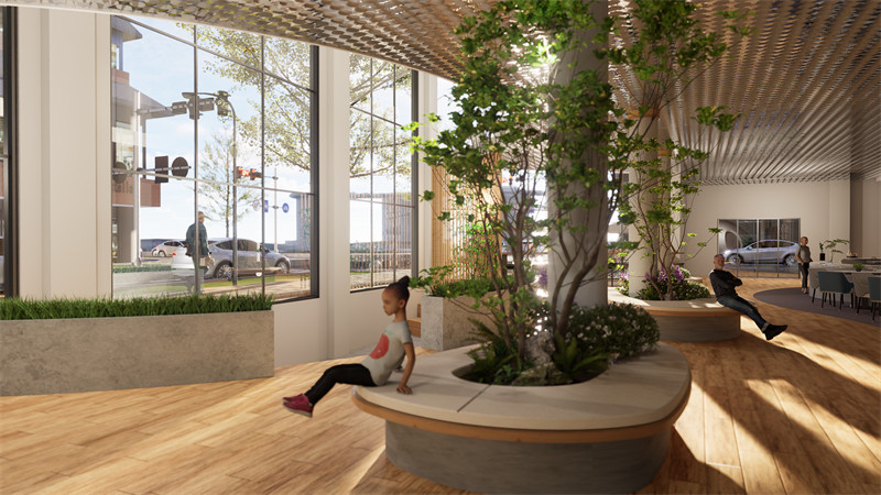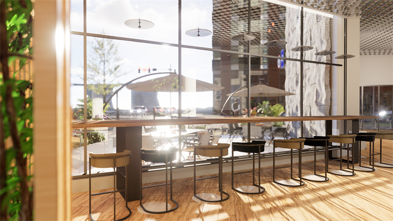 设计从全域视角出发,采用开放式布局,打破传统转角空间的封闭感,通过设置灵活的隔断、座椅和绿化带,形成多个功能区域,将空间分为室内、外板块设计: