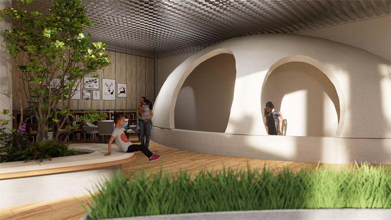 在室外区域引入透水铺装、绿植和雨水收集系统,用于灌溉植物、清洗路面等,,以减少积水问题并改善环境。设计在于精细化的微改造更新,形成一个既满足生态循环又引导可持续发展价值观的空间。