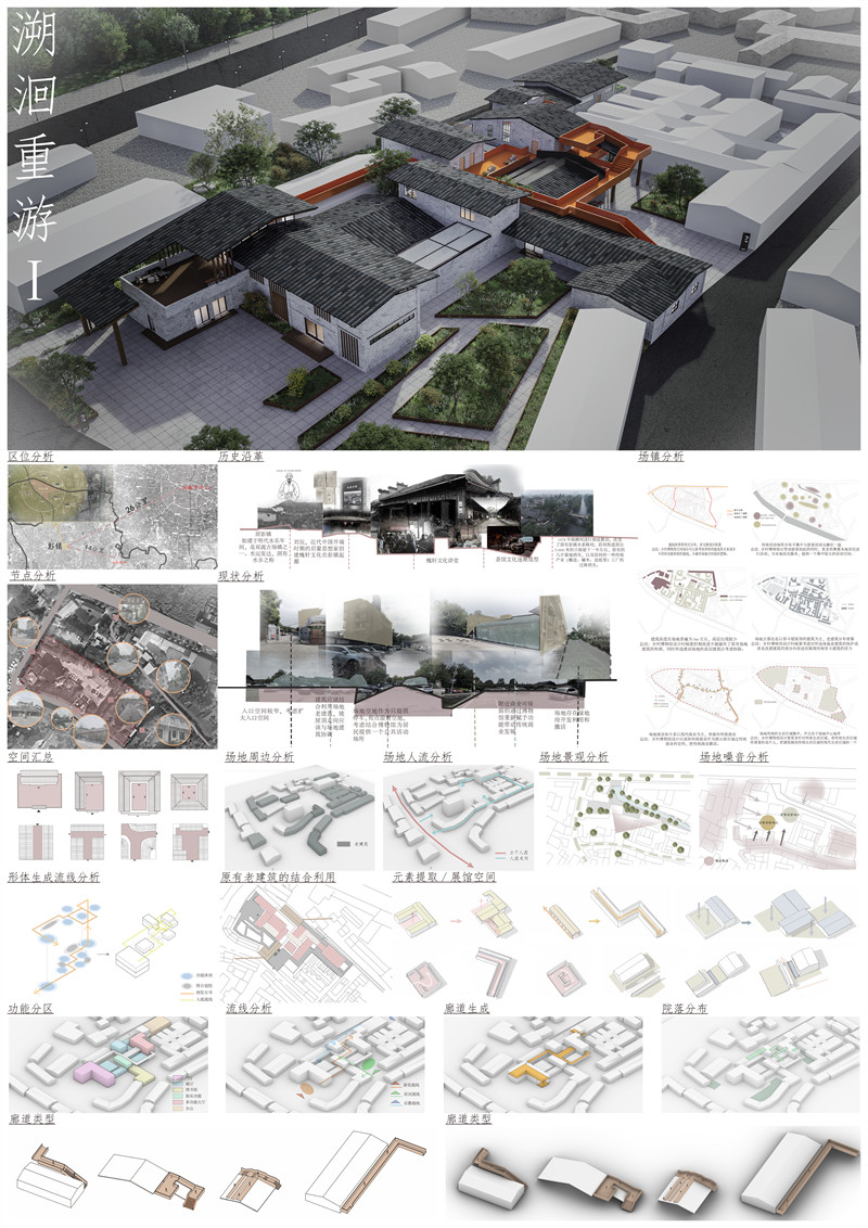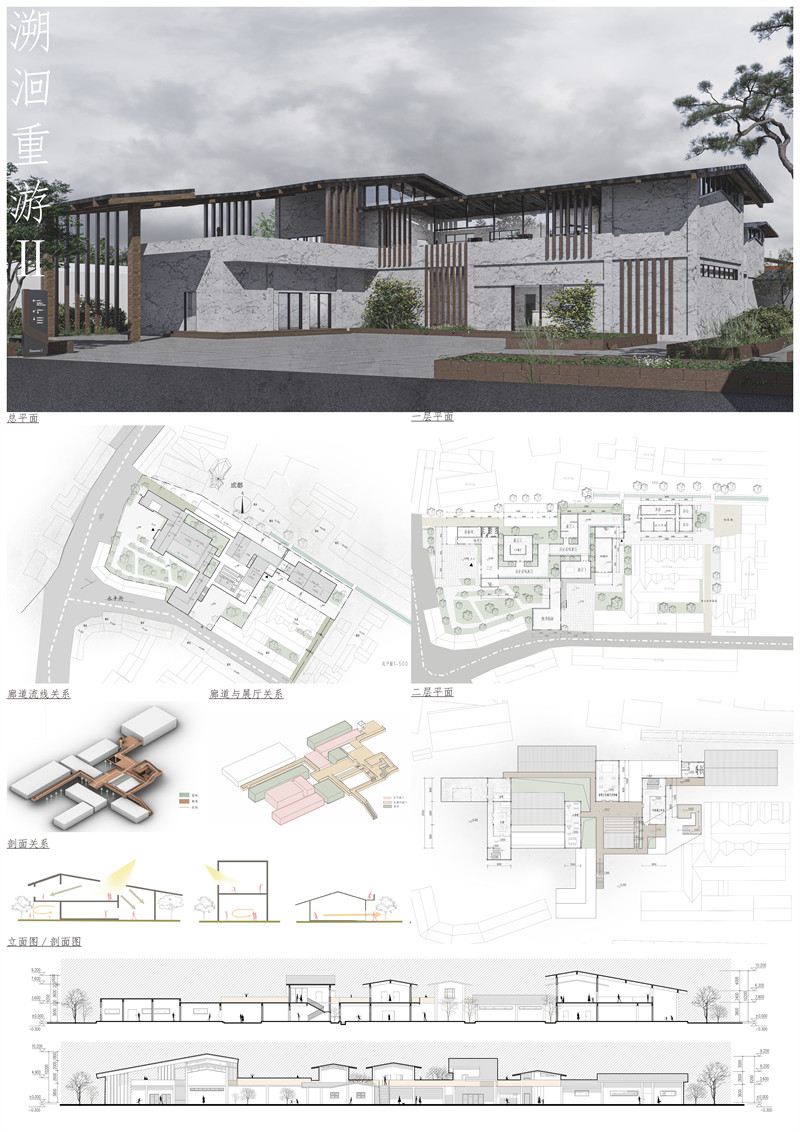 本设计致力于创建一处集展示、教育、体验于一体的综合场所,不仅重振彭镇历史荣光,更激活其未来发展潜能,成为承载文化传承与创新的重要平台。通过空间与技术的巧妙结合,彭镇乡村博物馆将成为一处独一无二的精神地标,唤起公众对乡土文化的重视与自豪,助力古镇复兴之路。场地坐落于古镇前端,博物馆旨在成为游客探索之旅的启航点,巧妙汇聚人群后再将其分流至古镇各隅,让博物馆于场地共生,激活全域活力。依托彭镇的水乡背景,本设计构想一座集文化展示与体验于一体的博物馆,意在成为游客了解古镇历史的门户。馆内流线以彭镇发展史为序章,借流水串联起时空的桥梁,引导游客步入一段历史之旅。建筑空间效仿鱼脊骨布局,辅以精致庭院,创造移步异景的独特体验。在二层空间特别设立的茶文化专区,品味彭镇的茶香岁月,成为连接居民与游客的共生桥梁。。空中廊道凌驾于历史展馆之上,提供全新视角,回望旅程,尽收眼底。本方案旨在打造一个多维感知的文博空间与彭镇建筑和居民共生,让每位到访者都能沉浸在彭镇的悠悠往事与茶香雅趣之中,体验一场难忘的溯洄之旅。博物馆与周围环境和谐共生,不仅是一座孤立的建筑,更是古镇生态链上的重要环节。