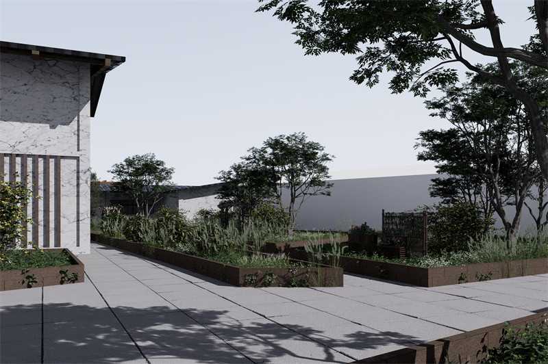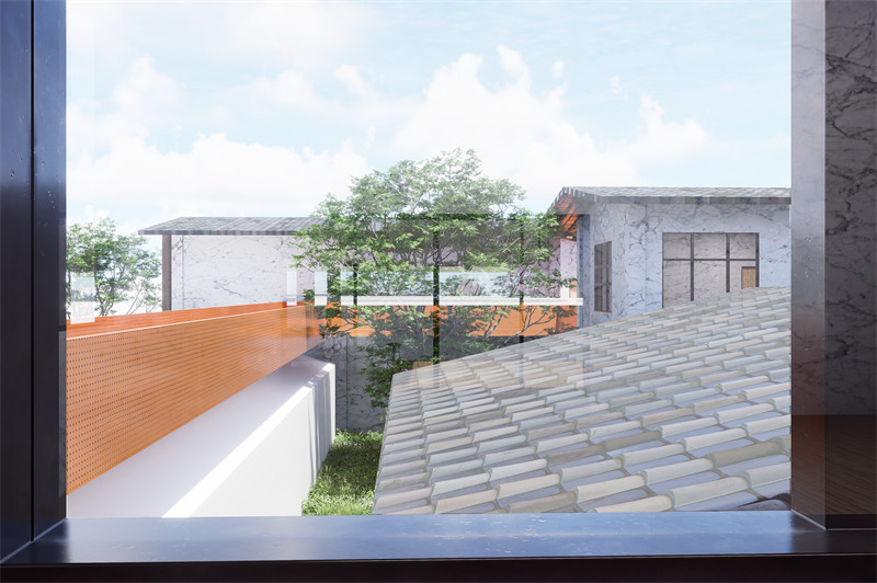 观景与体验:融入景观庭院,取景框眺望新彭镇,历史与现实交织。