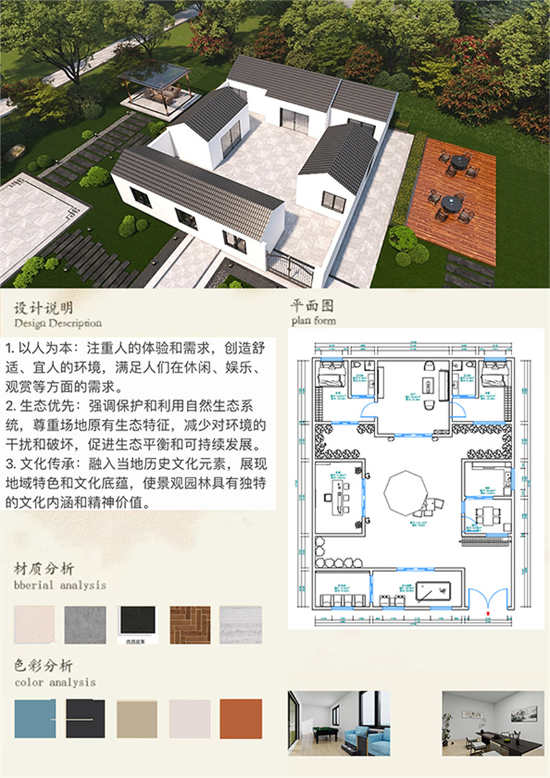 在色彩上,不同的色彩可以传达不同的情感和氛围,如暖色调可以营造温馨舒适的感觉,冷色调则使人感到宁静清爽。材质的选择则应考虑其耐用性、美观性和环保性。就地取材和环保材料是庭院设计的首选。