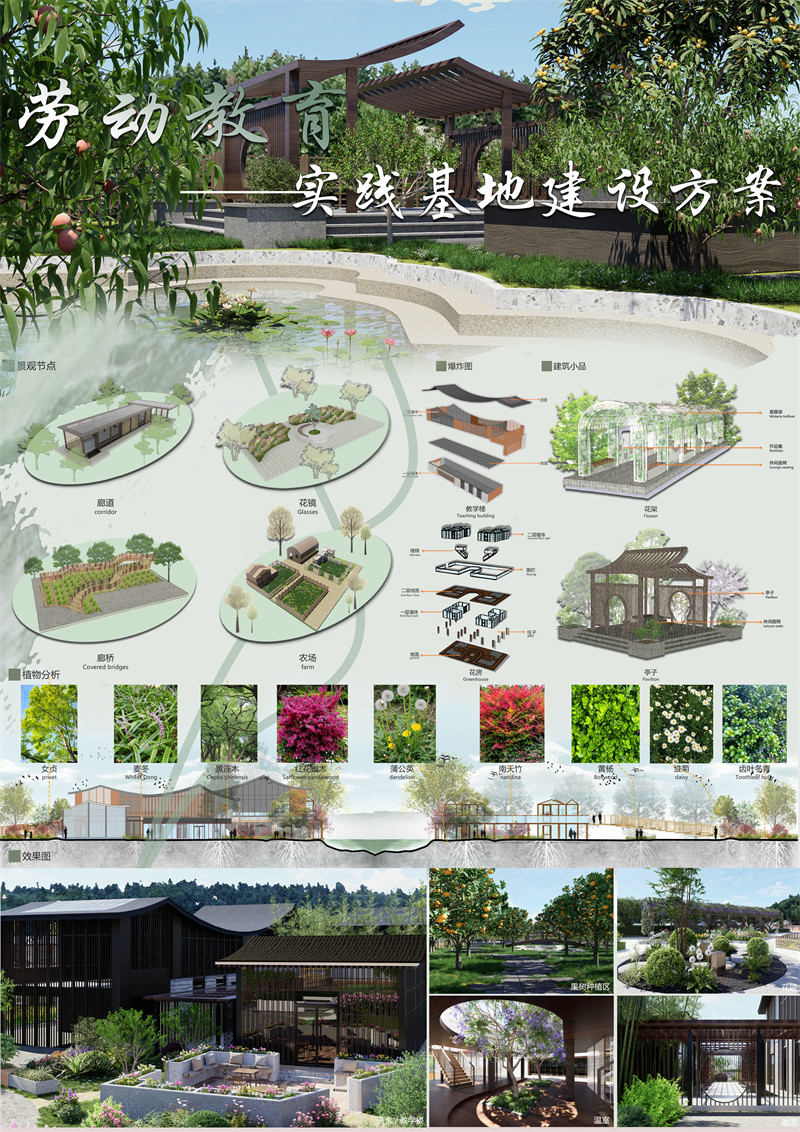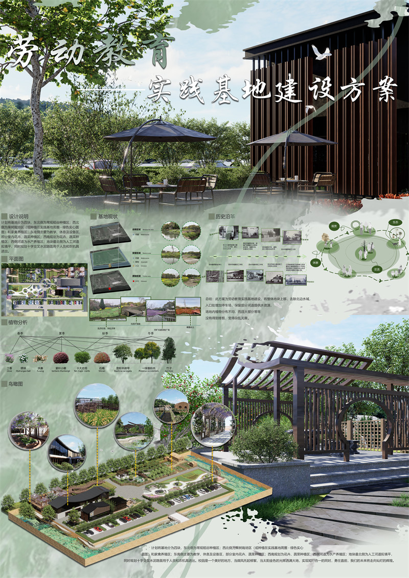 劳动教育是中国特色社会主义教育制度的重要内容,直接决定社会主义建设者和接班人的劳动精神面貌、劳动价值取向和劳动技能水平。为全面贯彻党的教育方针,落实全国教育大会精神,坚持立德树人,坚持培育和践行社会主义核心价值观。依据规划需要划分地块,建设小型封闭大棚;规划建设江南农耕文化陈列馆、茶舍、教学以及基地管理办公室;增设一个人力水车,兼具灌溉和观赏功能。计划将基地分为四块,东北侧为常规稻谷种植区;西北侧为果树栽培区(或种植在实践基地周圈-绿色实心圆图)和家禽养殖区;东南侧主要为教学、休息及设备区,部分室内花卉、蔬菜种植区;西南规划为花卉、蔬菜种植区;西侧河道为水产养殖区;地块最北侧为人工河道拟填平,同时规划十字交叉水泥路面用于人员和农机具进出。俯瞰入口,两侧设置停车场,环形道路引导至各个区域,校园标志位于整个区域的中心,茶社和教学区位于基地东南侧,面向广大莘莘学子,丰富校园生活。基地两侧为花卉,蔬菜种植区。集观赏,生态,交流,休憩为一体,培养学生劳动观念,实现知行合一。茶社和教学区位于基地东南侧,基地两侧为花卉,蔬菜种植区。集观赏,生态,交流,休憩为一体,培养学生劳动观念,实现知行合一。步入紫藤花架,校园历史缓缓展开,同时放置学生作品,赏景的同时,教学成果,专业特色一览无余。硕果与生机,自校园西北侧展开,枝繁叶茂下,生产,实践,开放,的设计原则在果园践行。季节赋予植物四季的变化。鸡,鸭,兔,分区进行管理,逐步形成了一个小型的农业生态园。廊桥连接两层室内花棚,按植物特性分开种植花卉,蔬菜等。校园是一个美好的地方,当微风托起柳絮,当太阳金色的光辉洒满大地,实现知行合一的同时,勇往直前,我们的未来将走向灿烂的辉煌。