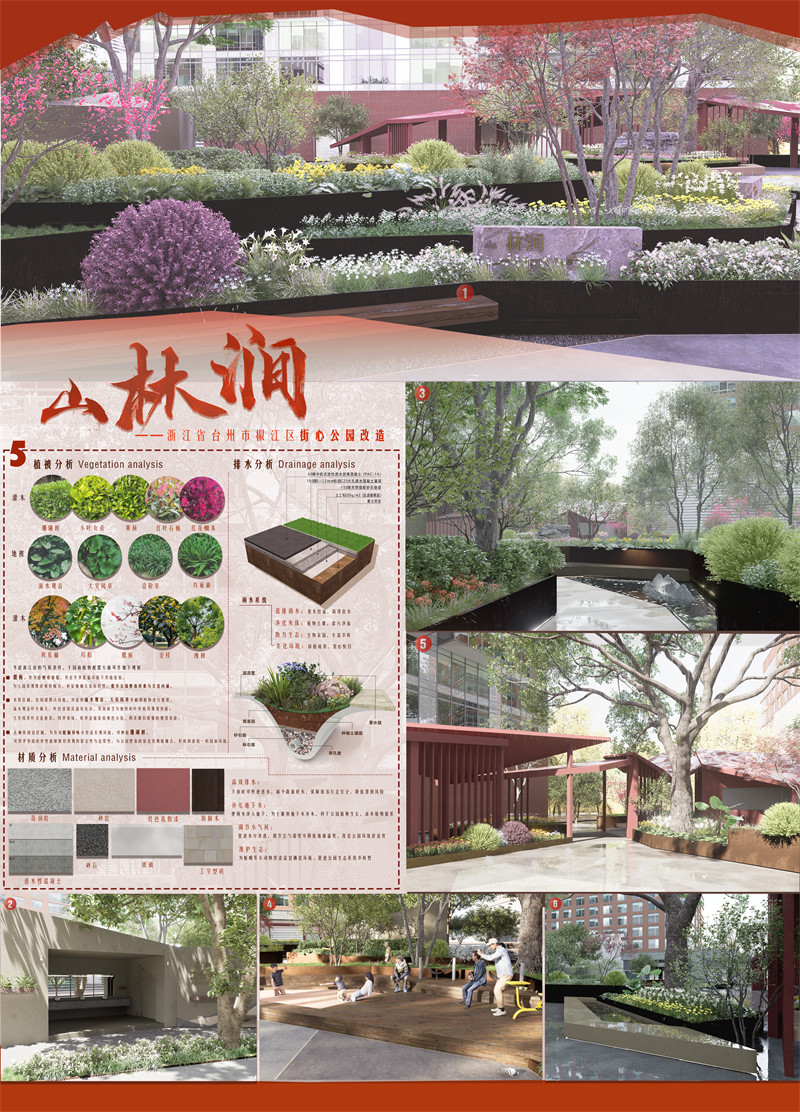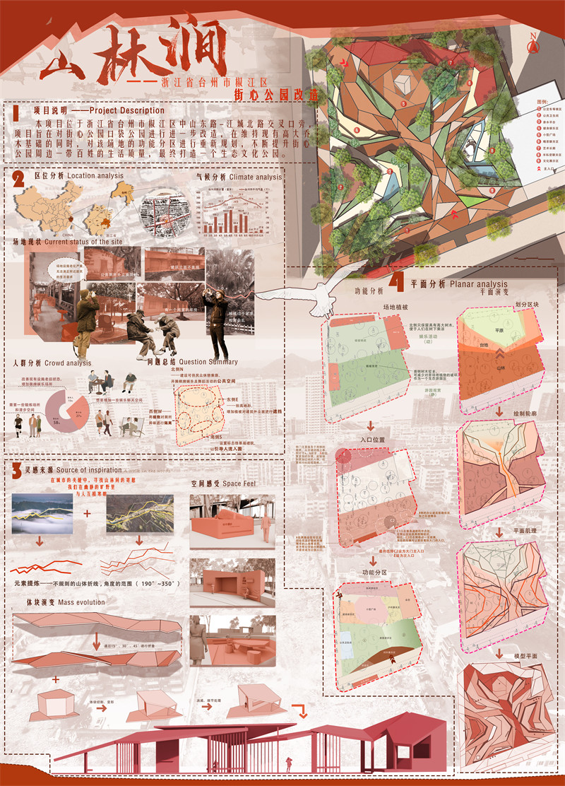 4.所选场地的具体位置:本项目坐落于浙江省台州市椒江区中山东路与江南北路交叉口毗邻区域,聚焦于对现存老旧街心公园的全面翻新与改造工作。秉持着生态优先与可持续发展理念,在充分保留现有高大乔木的基础上,深度整合周边环境资源与居民需求,对场地功能分区展开系统性的重新规划与布局。通过科学合理地划分休闲活动区、静谧散步区、儿童游乐区、健身运动区等多个功能板块,以多元功能复合的形式,致力于为不同年龄段与兴趣爱好的人群提供适宜的活动空间。此次改造旨在全方位提升街心公园周边居民的生活品质,塑造一个集生态性、功能性、美观性于一体的口袋公园范例,为城市公共空间的更新与优化注入新的活力,成为展现当地社区魅力与居民幸福感的重要载体。