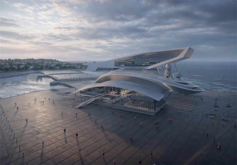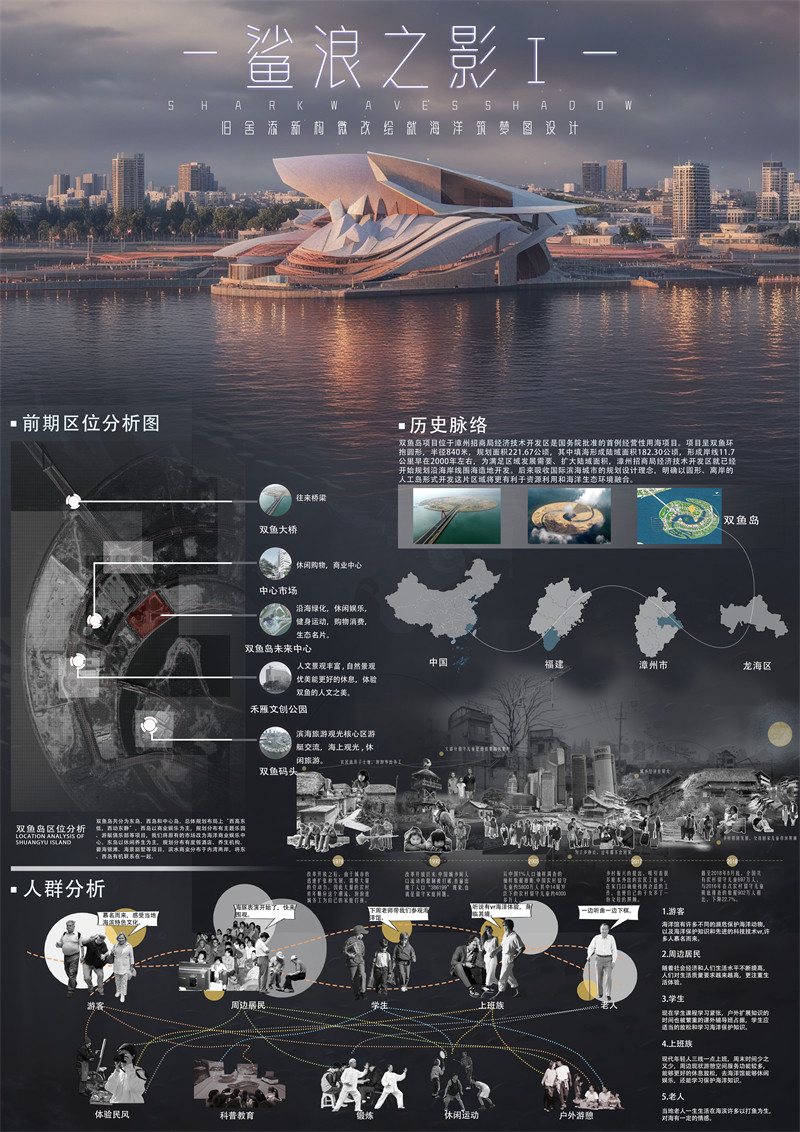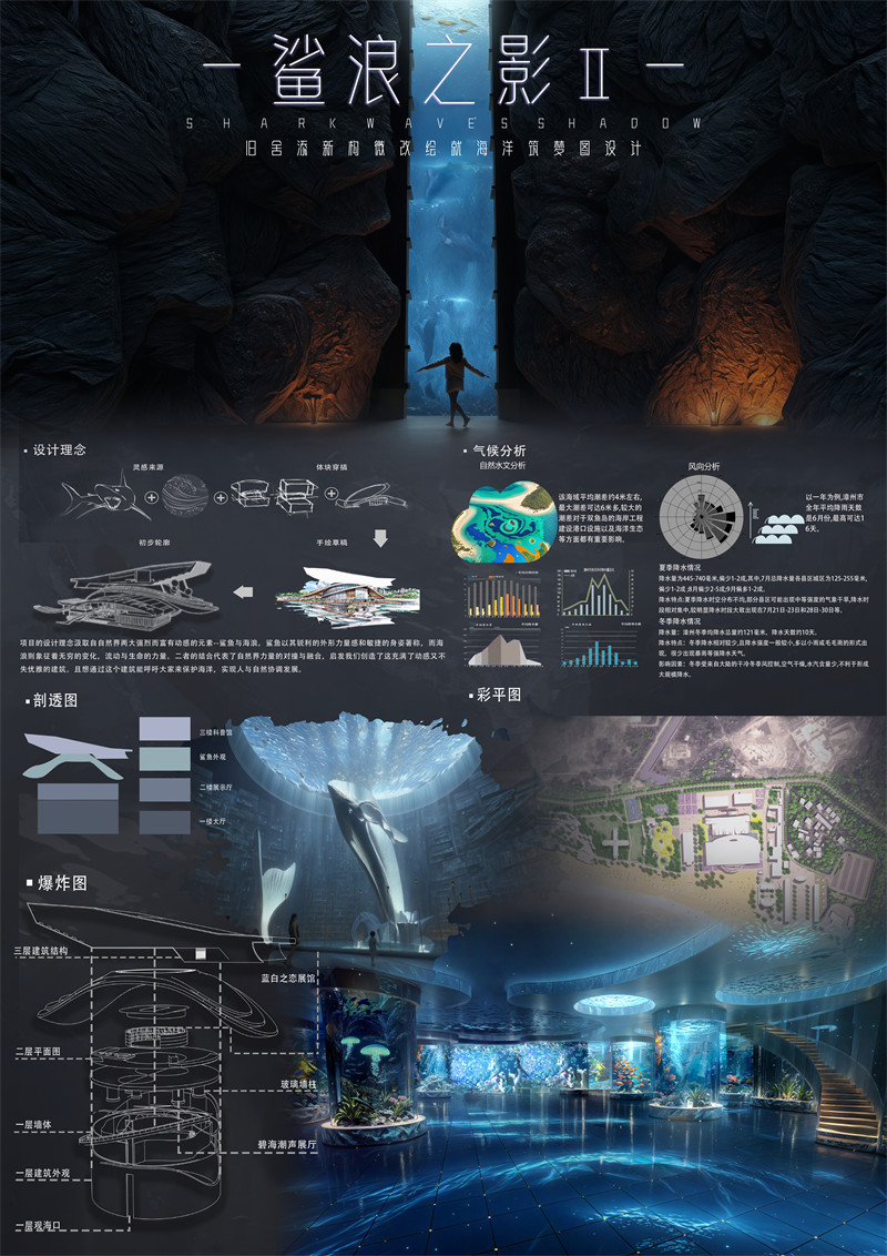 自然和人类的关系一直是一个热点话题,人与自然一直密不可分,如今双鱼岛处于荒废状态,急需焕发生机,我们希望通过海洋、自然的主题将游艇荟运动中心重新规划休整,再次唤醒双鱼岛的活力。我们的设计理念来源于双鱼岛的外观造型,双鱼岛整体外观是两只海豚组成岛,更准确的来说是中华白海豚,中华白海豚是国家一级保护动物也是世界濒危物种,我们的主题是从海洋大自然的保护出发,希望通过大家看见并且发现海洋以及海洋生物的美,从此呼吁大家来保护海洋,我们的设计外观从鲨鱼出发,双鱼岛荒废,我们想让双鱼岛焕发新生,鲨鱼的生存能力极强,希望海洋馆可以像鲨鱼一样适应不同的环境,拥有顽强的生命力。不仅可以激发地方的经济活力,还可以增加双鱼岛的曝光度,以此来吸引更多的游客来双鱼岛。