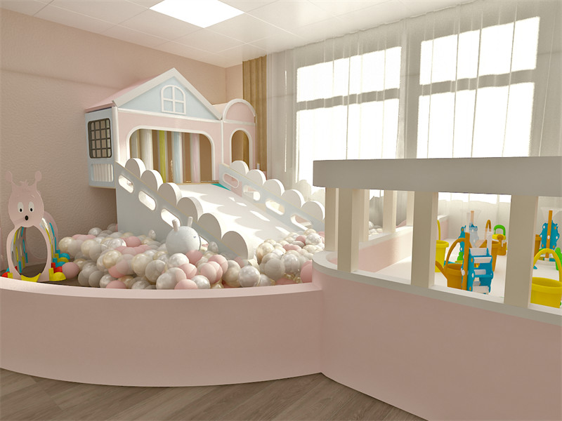 ②色彩搭配以暖色调为主,如米黄色、淡蓝色、浅木色等,营造温馨舒适的环境氛围。在不同功能区域,通过局部色彩的变化来区分功能与营造氛围。例如,儿童游乐区降低了色彩的饱和度,不会过度刺激儿童视觉神经,可有效避免视觉疲劳与情绪焦躁。柔和色调能营造安静舒适氛围,有助于儿童集中注意力,让他们在平和环境里尽情玩耍,促进健康成长。健身运动区则以明亮的蓝色与绿色为主,营造清新动感的运动氛围。