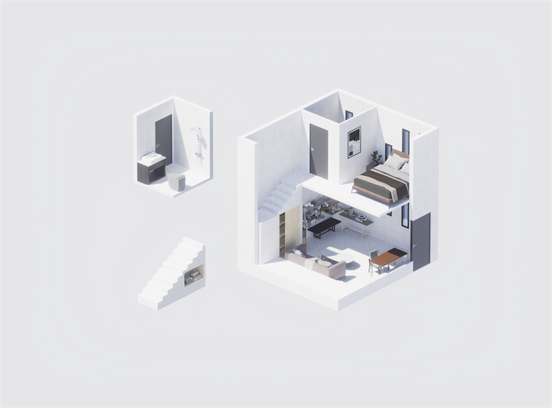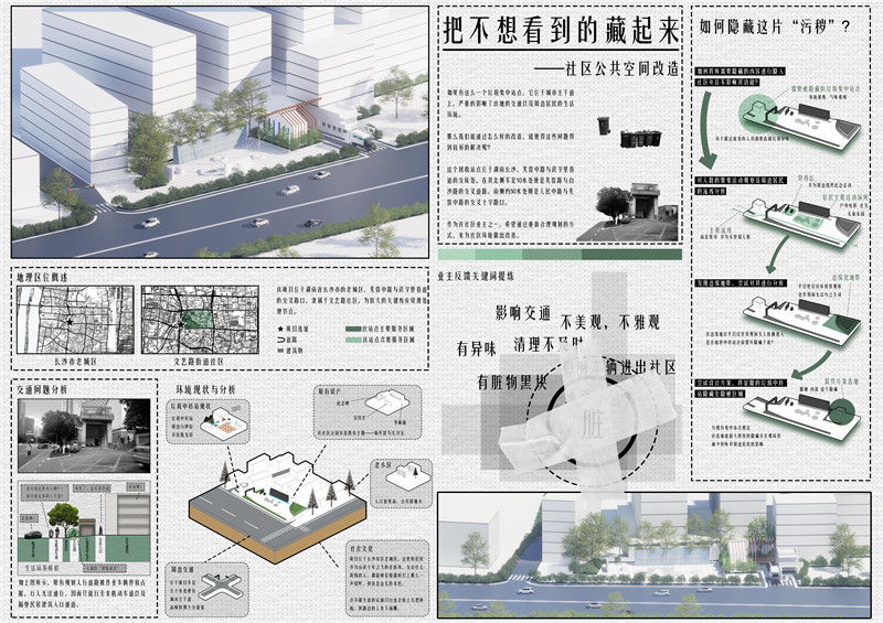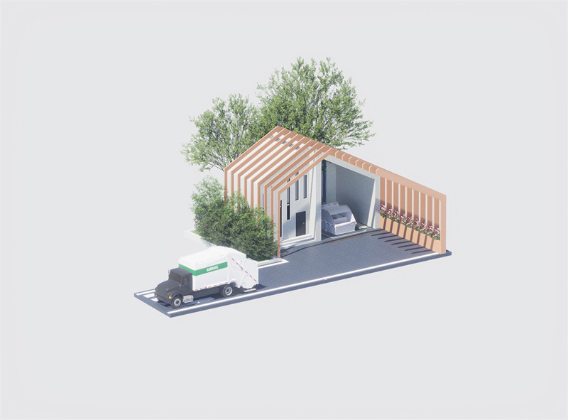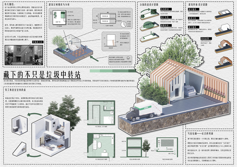 设计意图通过隐藏原有污秽遍布的垃圾中转站,同时通过重新设计、改善城市工作者们的工作环境,来保障其基本权益。同时,也为社区内的美好环境的建设提供一些可行创意。