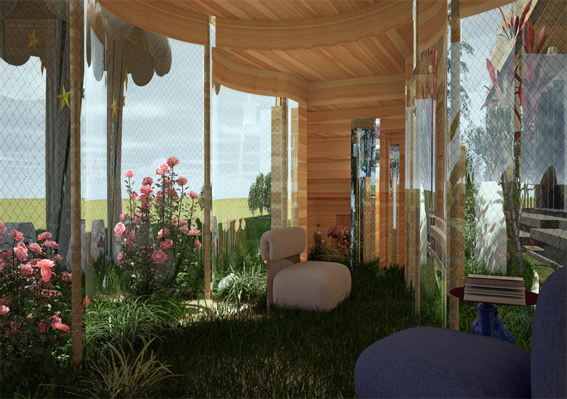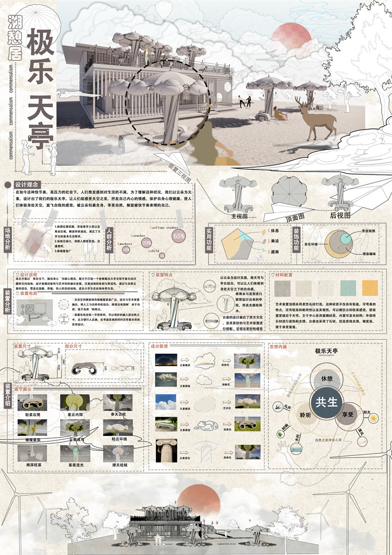 为了解决大学生生活节奏快的问题,我们选用了生活空间来作为我们此次设计的场地。在这一过程中,我们以常见的自然元素为设计主体,如水流、云朵以及天空等。这些自然元素能为空间设计增添宁静悠远的氛围,使大学生的心绪情感变得缓和与温适,并且这些自然元素的寓意也正与我们的设计理念相合。