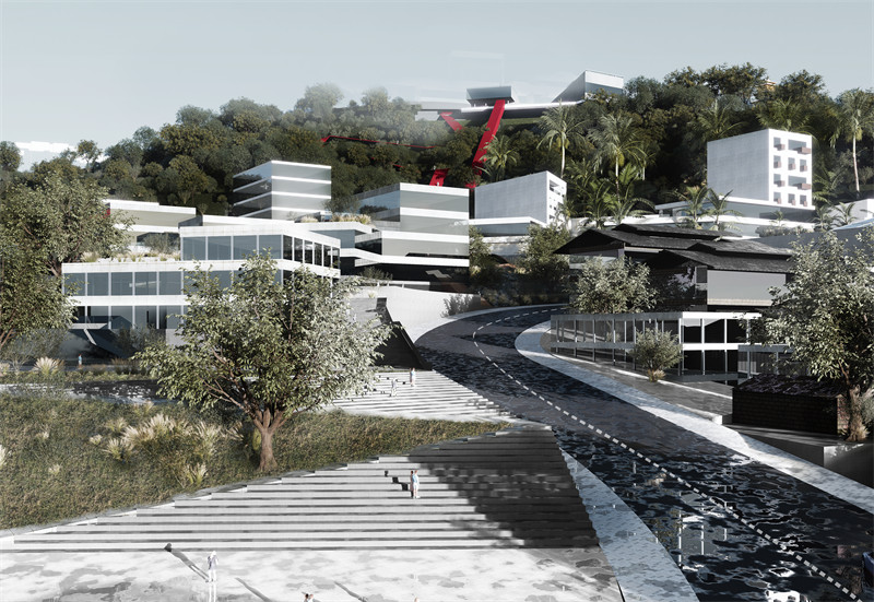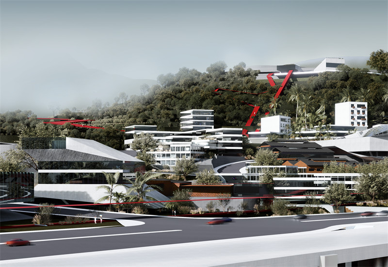 高村作为该片区城市最重要的社区共享场所,承担连接居住区和艺术园区的重要责任。结合背后山体巨大的高差,高村具备台地属性。我们置入社区相关功能并打散建筑体量,意图创造八方通达畅通无阻的无界社区。