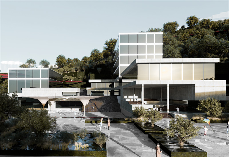 山地城市设计尤其关注整体空间的连续性和如何利用地下空间,设计通过平衡土方,在高差大的堡坎处一方面利用建筑消解,另一方面人工造景延续空间序列;同样关注桥下空间如何使用,以及桥下空间的整体连续性。