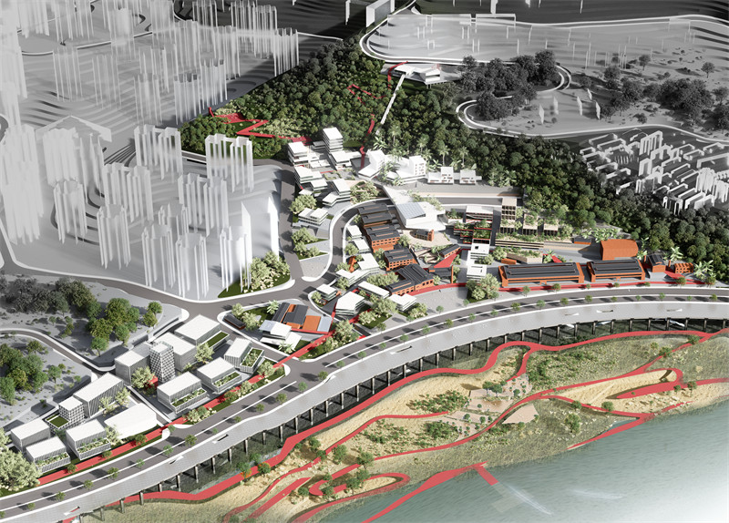 从山顶到江岸形成一条完整的爬山主轴,其中大小广场错落有序,每部分建筑与广场都显示出独特的性格:工业遗址密度最高的中间及右侧地块通过利用新建建筑和既有建筑来形成老城肌理的街道尺度,形成东西向的内部步行街,与爬山主轴共同交错成最主要的漫步系统。左侧的科创园区从城市界面向临江界面分三级跌落,建筑最大程度向江面打开尽可能提升土地价值,连廊东西贯通形成风雨无阻的步行系统,改变当地微气候。北侧山体有一长条禁建区,于是设置爬山电梯和栈道越过禁建区与山顶的社区中心连接,使得社区中心既能服务背后的住宅区,又是山下城市片区的延伸。