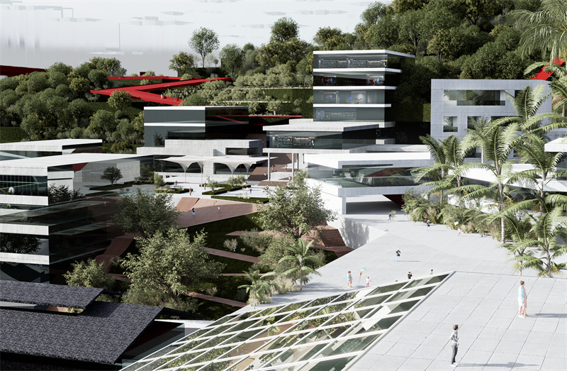 场地背山面水,拥有非常大的生态修复空间和生态补偿潜力,设计通过绿化渗透将场地生态恢复首先从主轴引入山林景色,两侧也有不同程度的绿色渗透,内部有一条绿化率极高的生态绿廊步行体系连接整个场地,二层连廊也将创造宜人微气候;