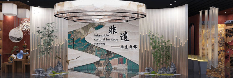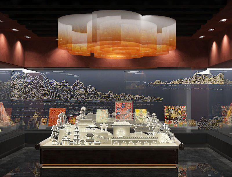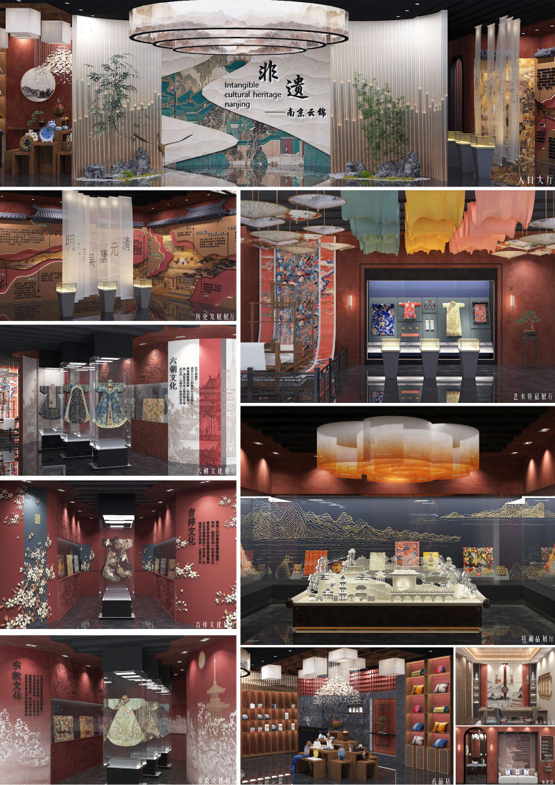 该项目的初衷是实现历史文化与现代生活的联系,通过将云锦艺术的视觉元素合理地提炼和转化,融入现代展馆空间当中,从而建立起历史与现代相互交流的平台。在具体的设计当中,通过合理地划分区域、路线引导、数字技术的运用等来优化空间体验,打造多功能的展馆空间,使前来参观的观众能够循序渐进地了解非物质文化南京云锦,同时又能在空间中体会到舒适感以及趣味性。