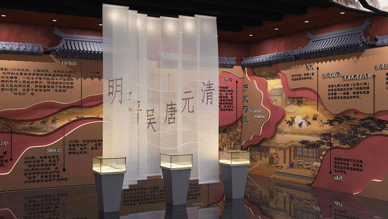 (2)历史发展展厅:历史发展展厅充分运用绸缎柔顺的曲线造型展开设计,也代表着南京云锦源远流长,跌宕起伏的发展历程,并且在墙面上设计有代表中国古代宫廷建筑屋顶的造型,增加展示形式的艺术性。展厅的中央放置有印着朝代名称的垂帘,既能够分割空间,又与历史发展展厅的展示内容相呼应,使观者能够清楚地知道这块区域的功能和展示的主题。