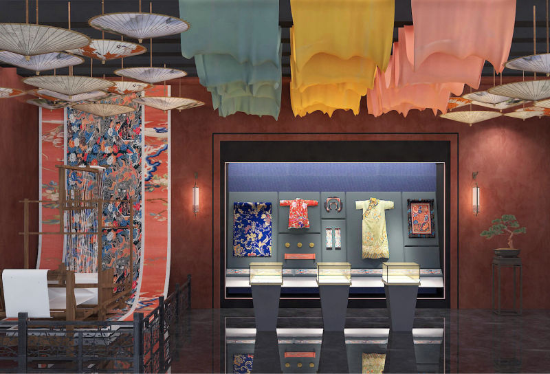 (3)艺术特征展厅:该展厅主要介绍南京云锦的特点,包括色彩搭配、纹样图案、使用材料以及织造工艺等等,并放置有织造机,使观者直接感受南京云锦的织造过程。艺术特征展厅最具特色的设计是天花板的设计,中间运用云锦的绸缎自然垂落,两侧以印有云锦图案的古代油纸伞加以衬托,充分将展馆空间设计与云锦艺术特征相结合,丰富展馆空间的展示形式。