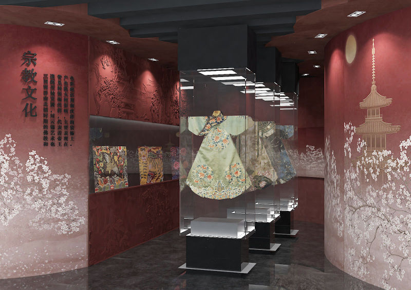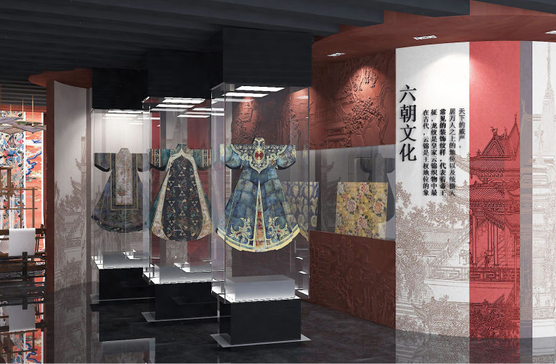 (4)历史文化展厅:历史文化展厅由六朝文化展厅、吉祥文化展厅、宗教文化展厅三部分组成,并用曲线型的墙体加以划分,形成相对独立但又相互关联的展示空间。六朝文化展厅主要展示代表古代封建礼仪制度的龙袍、朝服、官服等等,吉祥文化展厅陈列了以具有吉祥寓意的纹样作为装饰的云锦文物,而宗教文化展厅展示南京云锦文物当中古代用于祭祀的祭品或者印有宗教图案的珍品。