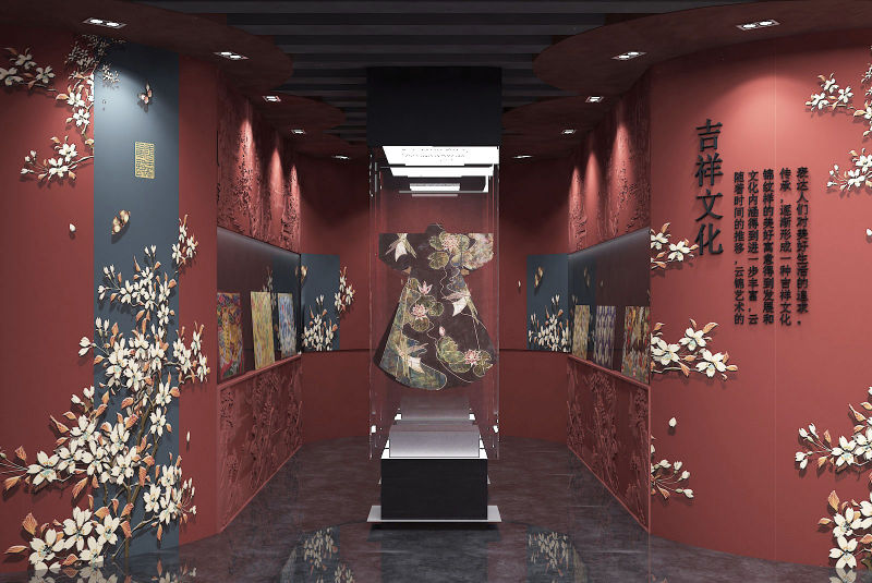 南京云锦色泽鲜艳亮丽,美如天上的云霞,在古代是专门为皇室贵族做服饰之用,为了凸显王权,所以多倾向于选择暖色调,例如红色、黄色等等。在该项目的空间设计中为了向人们传递南京云锦的色彩观念,使用暖色与其相呼应,同时又要保持历史类展馆空间庄重沉稳的气质,所以使用较为深沉的颜色,墙壁使用深红色,天花板和地面以及展柜使用深灰色,同时还搭配深木色以增添空间的中式韵味。