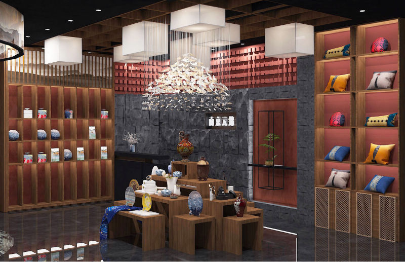 (5)云锦相关产品商店:展馆游览路线的末尾还设计有礼品店,售卖云锦相关文创产品、云锦服饰、云锦丝巾、云锦抱枕等等,目的是将云锦艺术融入现代城市生活当中,从而促进云锦艺术的传承和创新。