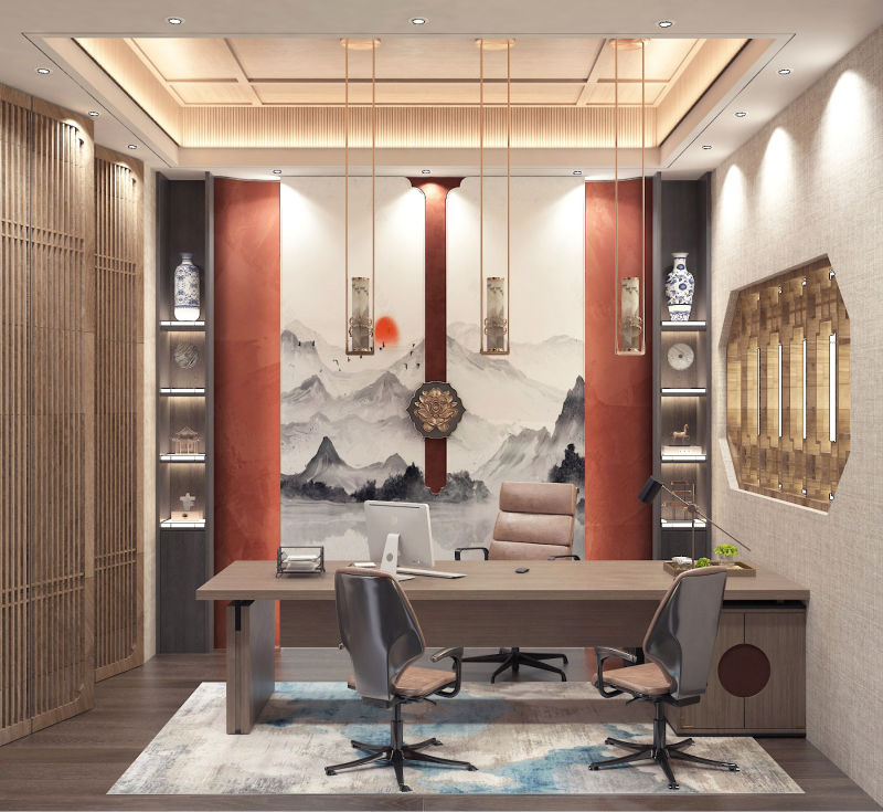 (7)办公区:该场地的办公区域也运用中式的风格,以米色墙纸搭配浅木色装饰以及深咖色木地板进行设计,运用传统中式的窗户造型,墙面结合浅木色的屏风加以装饰。在馆长室的设计中,其背景墙运用中式水墨山水图案作为主体,同时用展馆空间的主题颜色深红色加以点缀,具有素雅独特的韵味,凸显办公室使用者的身份与气质。