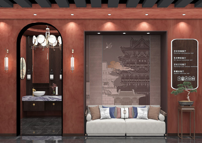 (8)细节设计:展馆空间在卫生间旁边设计有休闲沙发,为观者提供休息、交流的场地,休闲沙发的背景墙以深咖色作为主体,与深红色的墙体颜色相协调,同时运用中国古代建筑的图案,符合展馆整体空间古色古香的文化气息。并且旁边设计有标志牌,引导观者进行参观,优化游览体验。