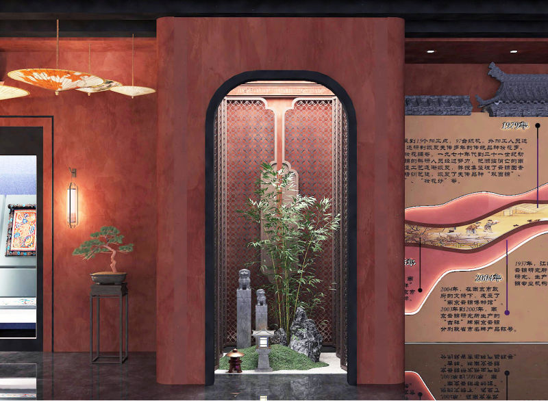 在历史发展展厅和艺术特征展厅的中间还有一块区域放置了园林小景装置,运用拱门的造型将观者引入景色当中,给观者一种穿越时空,置身于历史的感受,更好地沉浸于展馆空间的氛围当中。同时绿色的植物为展馆空间增添生机和活力,仿佛也给云锦文物带来了生命力。